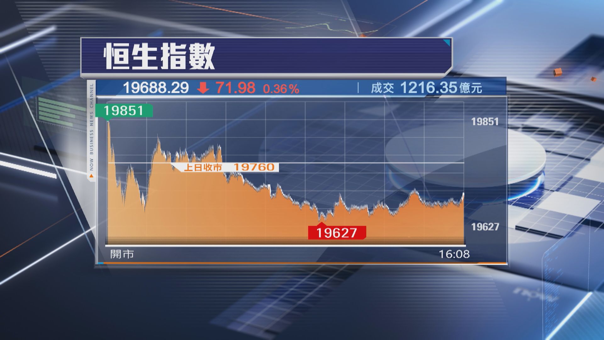恒生指數今日(6日)高開88點,已接近全日高位,其後窄幅上落,午後最多跌132點,低見19627點,收市跌71點,報19688點。大市全日成交縮減至逾1216億元。
