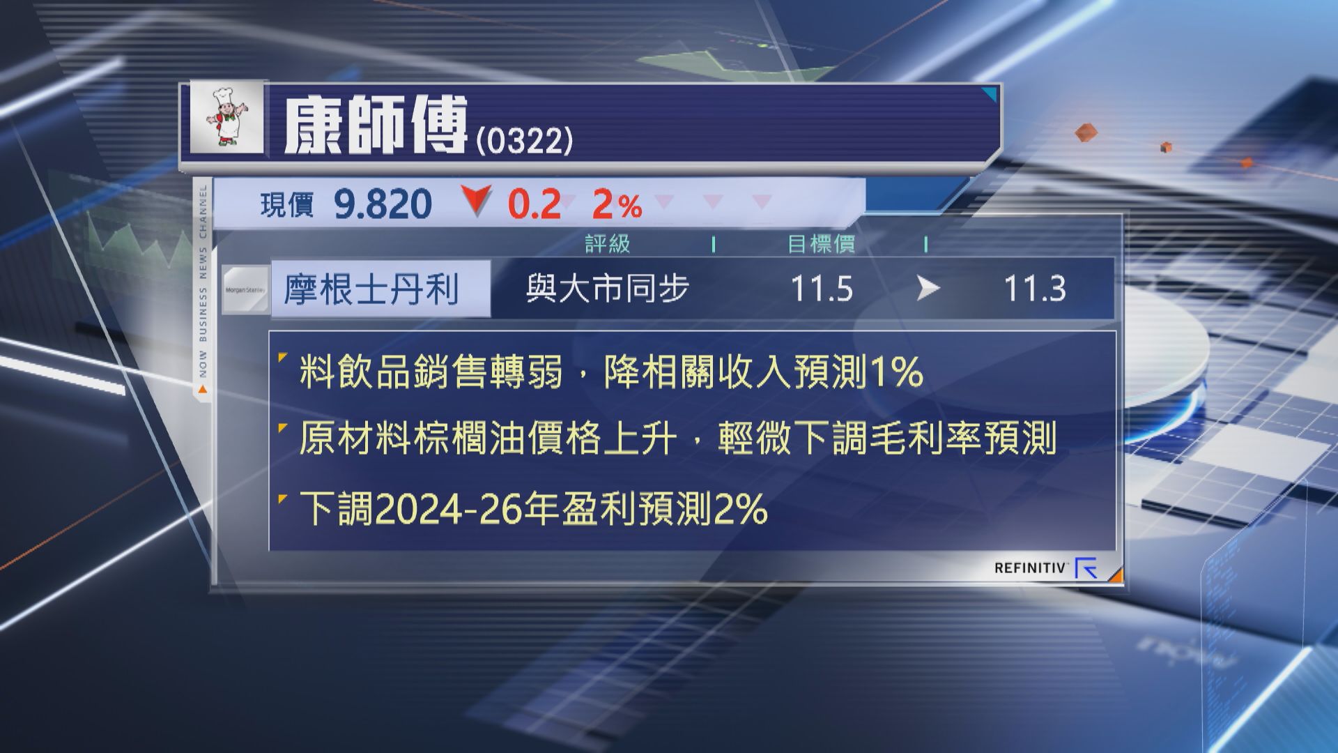 【Now財經台】摩根士丹利輕微下調康師傅控股(00322)目標價,由11.5元降至11.3元,維持「與大市同步」評級。