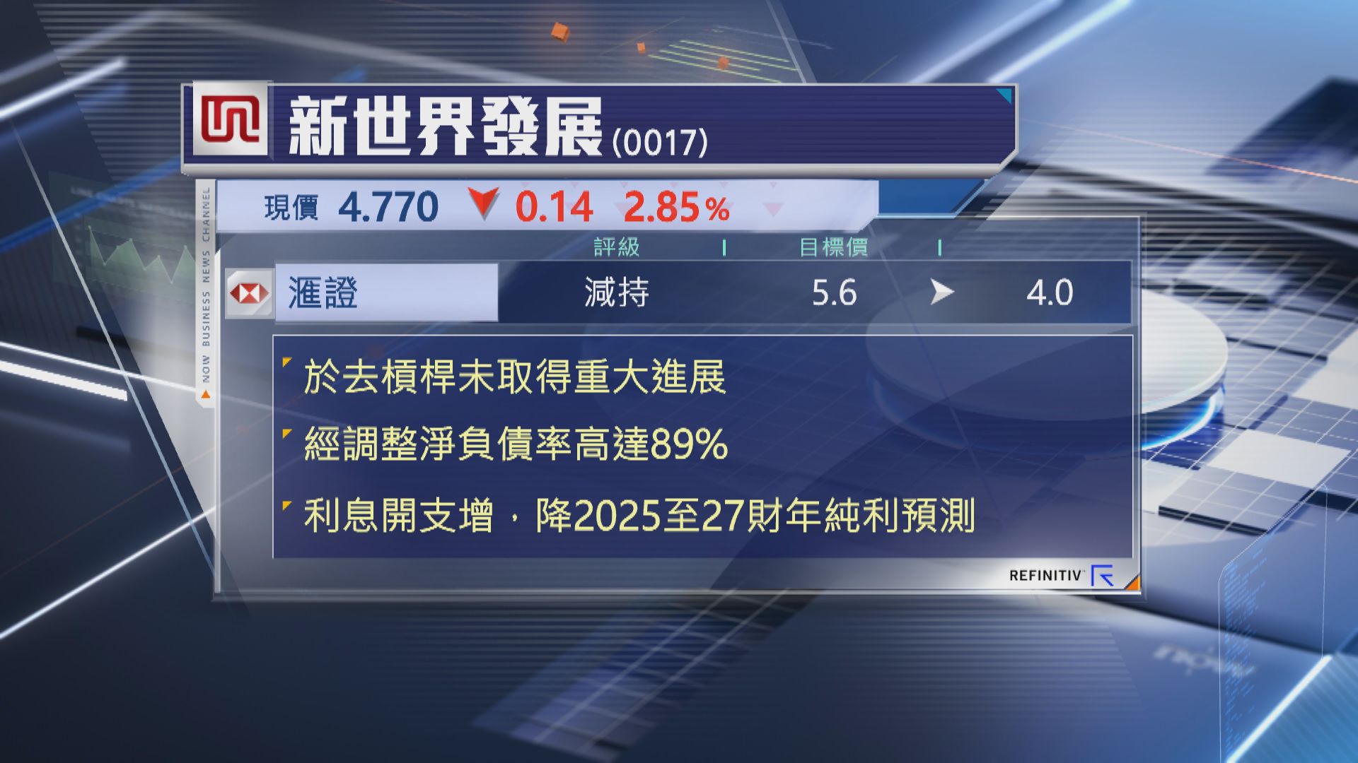 【Now財經台】滙豐證券大削新世界發展(00017)目標價28%至4元,相當於較資產淨值(NAV)大幅折讓86%,維持「減持」評級。