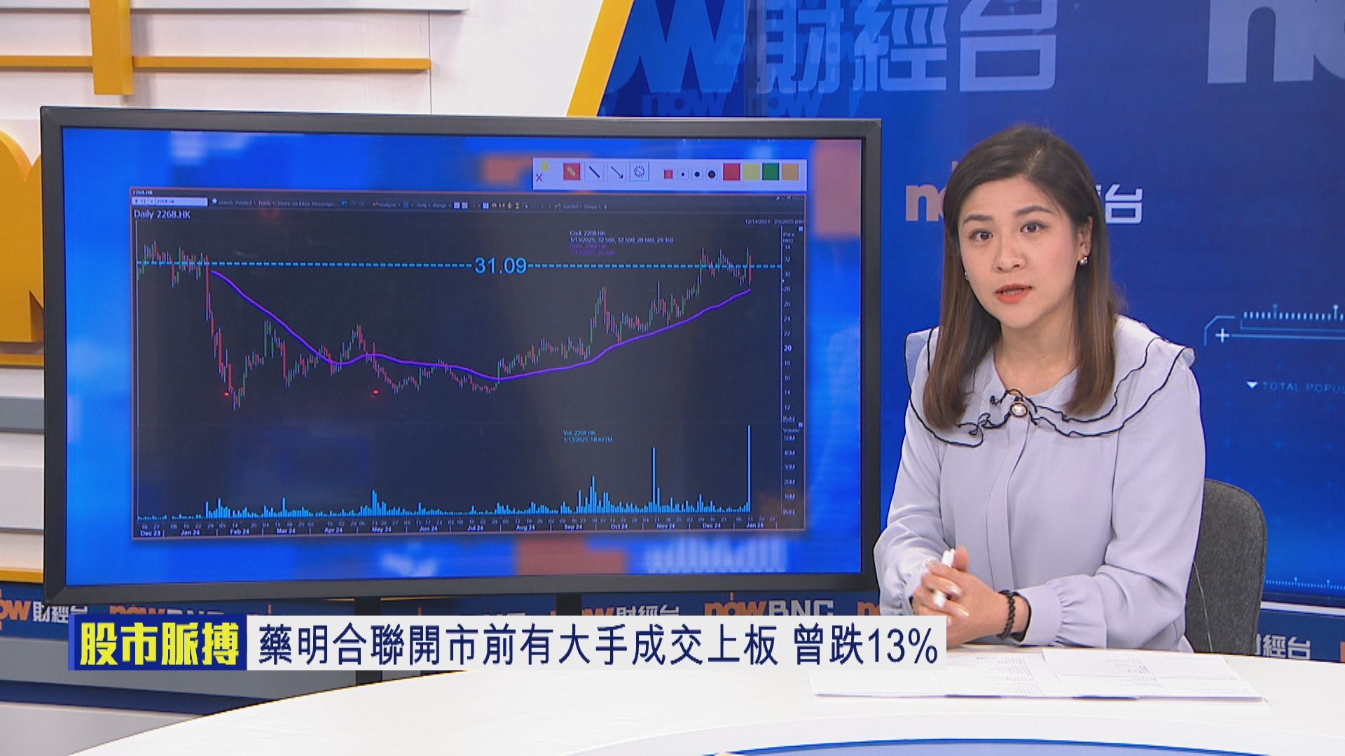 【Now財經台】藥名合聯(02268)股價今日(13日)低開逾1%,但已是暫時高位,之後跌幅不斷擴大,一度重挫逾13%,低見28.6元,失守今早大手上板每股成交價31.09元,成交股數較過去100日同時段平均增2倍,暫時成交金額逾18億元。