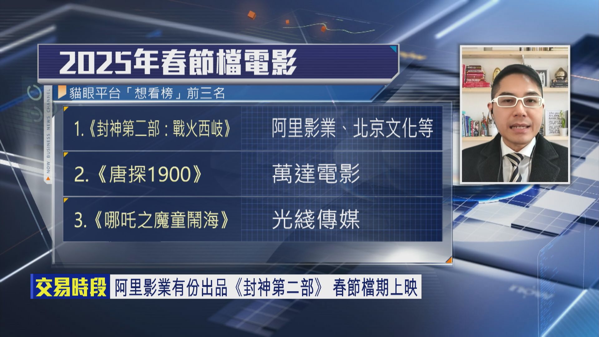 【Now財經台】臨近農曆新年,意味內地春節電影檔期已殺到,雖然暫時未見有特別措施谷票房,但睇嚟都幾熱鬧,今個春節檔期共有7套電影上映,包括阿里影業(01060)有份嘅《封神第二部》,暫時已打入貓眼平台最受歡迎電影排行榜第3位,2025年嘅春節票房有冇機會大翻身,扭轉2024年暑假、國慶檔期嘅頹勢?對阿里影業股價又有冇幫助?