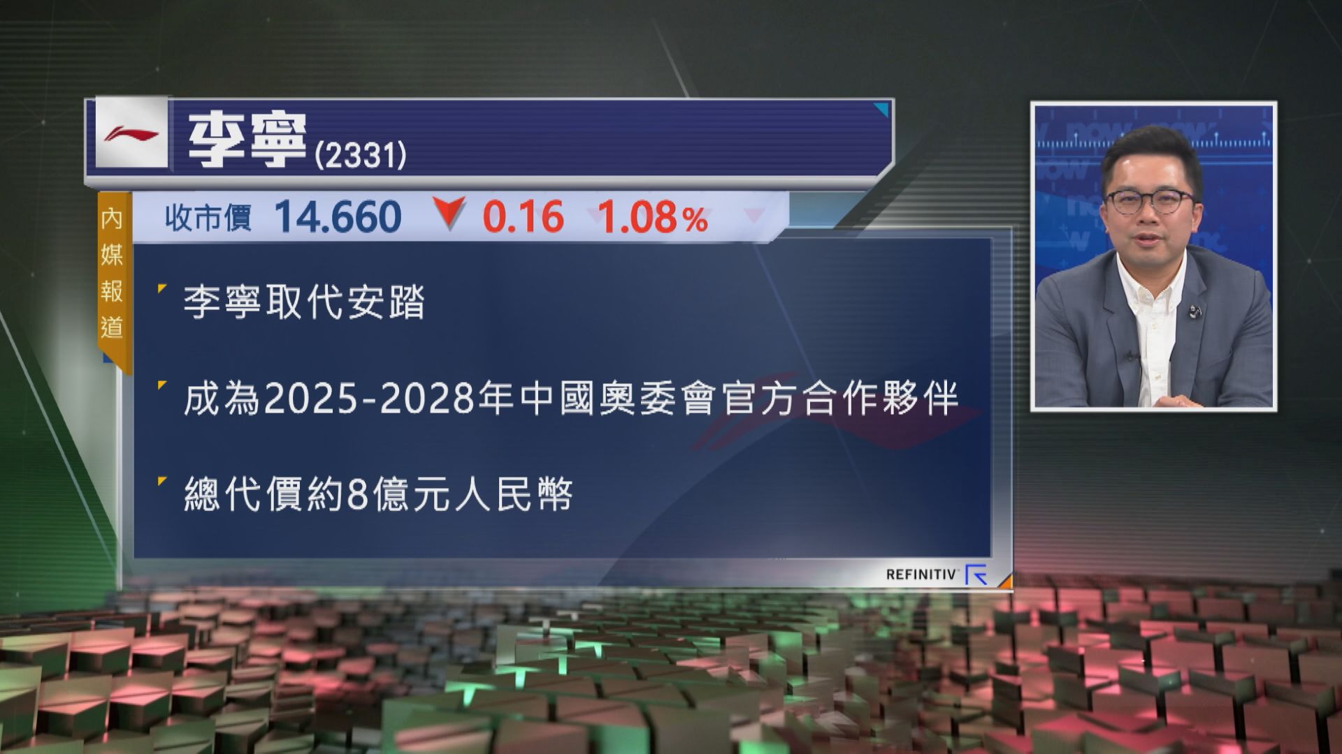 【Now財經台】有消息指,李寧(02331)取代安踏體育(02020)成為中國奧委會2025-2028年官方合作夥伴,代價約8億元人民幣。
