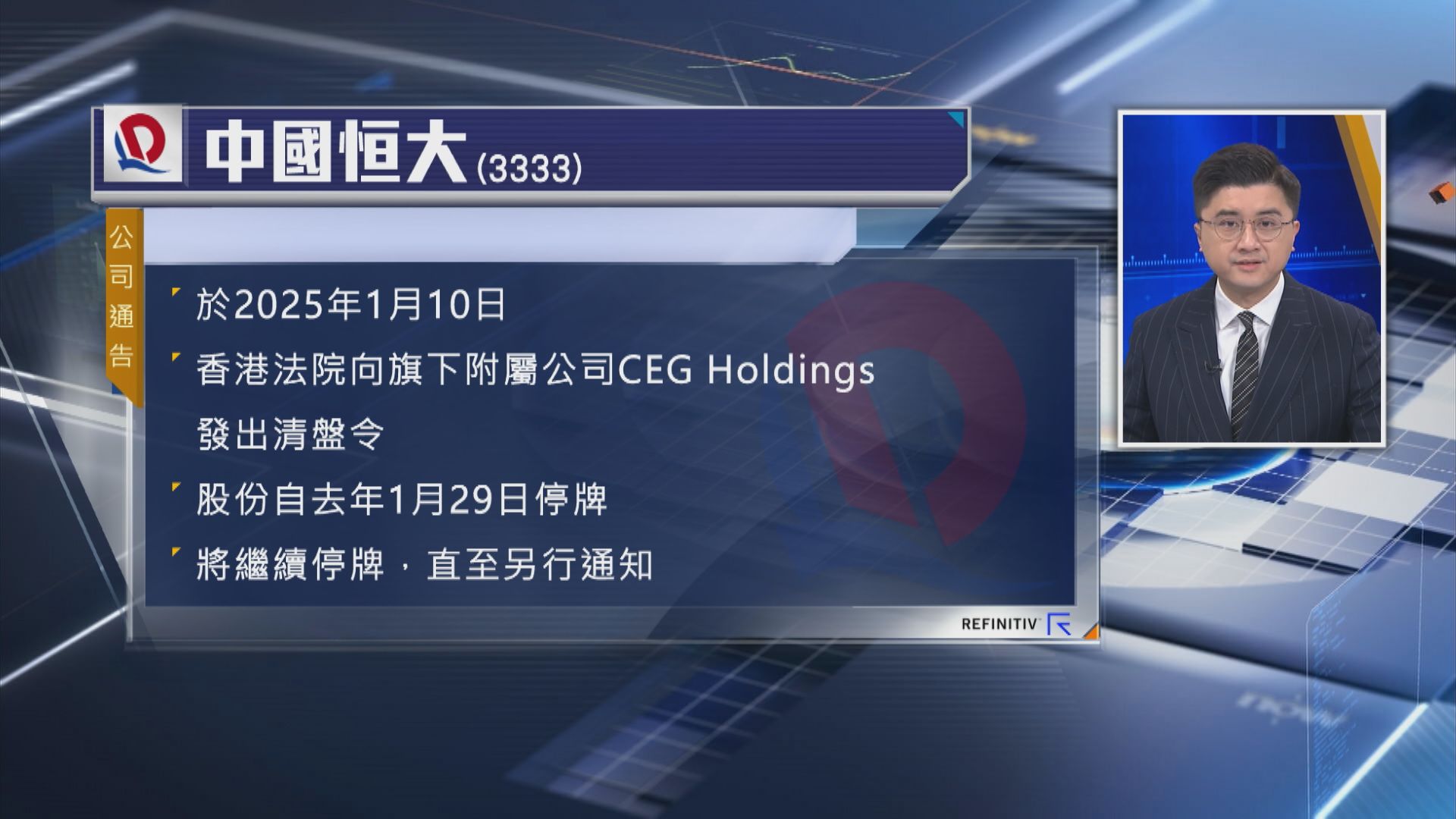 恒大的通告指,香港法院於2025年1月10日,向旗下附屬公司CEG Holdings發出清盤令。