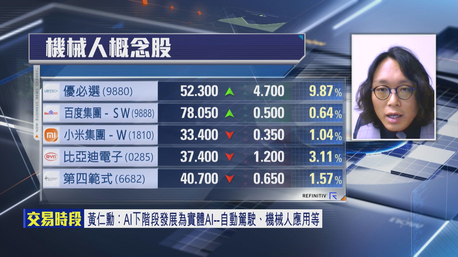 Casper又話,好多公司都處於實驗性階段,人形機械人嘅技術要求及成本高,暫時未見到內地有明顯優勢嘅公司,喺港股中,比亞迪電子(00285)係最明顯符合機械人概念嘅公司,其他就要觀察多一段時間。