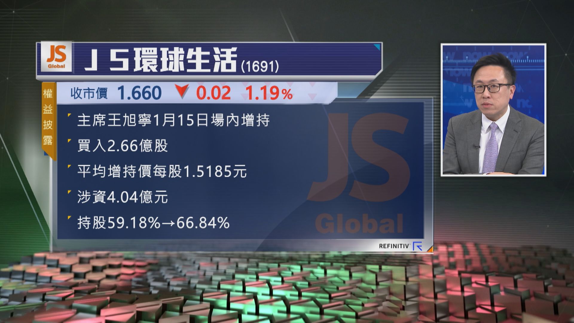 【Now財經台】JS環球生活(01691)主席兼大股東進一步增持股份,持股升至66.84%。