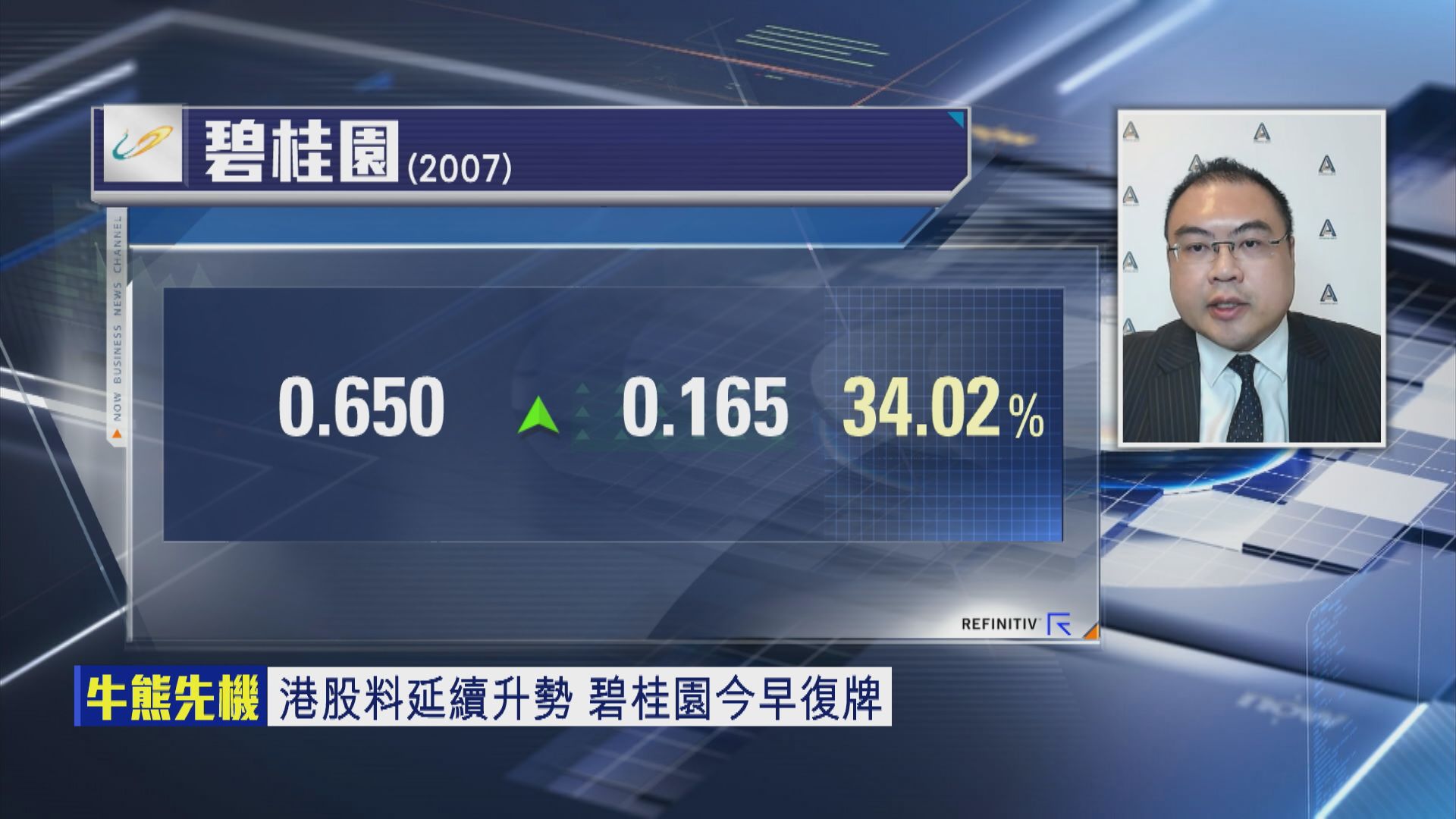 高富金融集團投資總監梁偉民估計,碧桂園復牌唔會特別好,成功復牌純粹係公司做返年報,滿足復牌要求,基本面冇任何改善,財政問題仍然嚴峻,停牌期間甚至不斷惡化。雖然停牌期間中央不斷出招救內房,例如減息、撤銷限購等,但呢啲政策其實對陷財困嘅房企冇任何幫助。