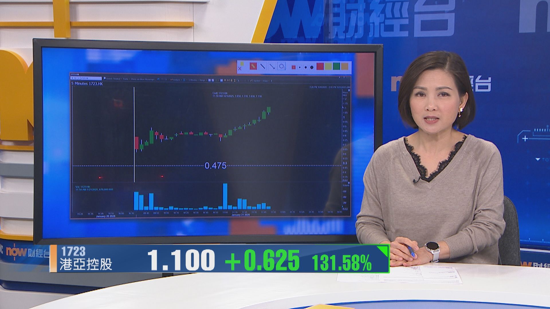 【Now財經台】毫子股港亞控股(01723)今日(21日)復牌,股價急升,大幅高開64%後,愈升愈有,早市一度勁升1.1倍,高見1元,中午前成交金額逾3700萬元,成交股數就較過去100日同時段大增15倍。