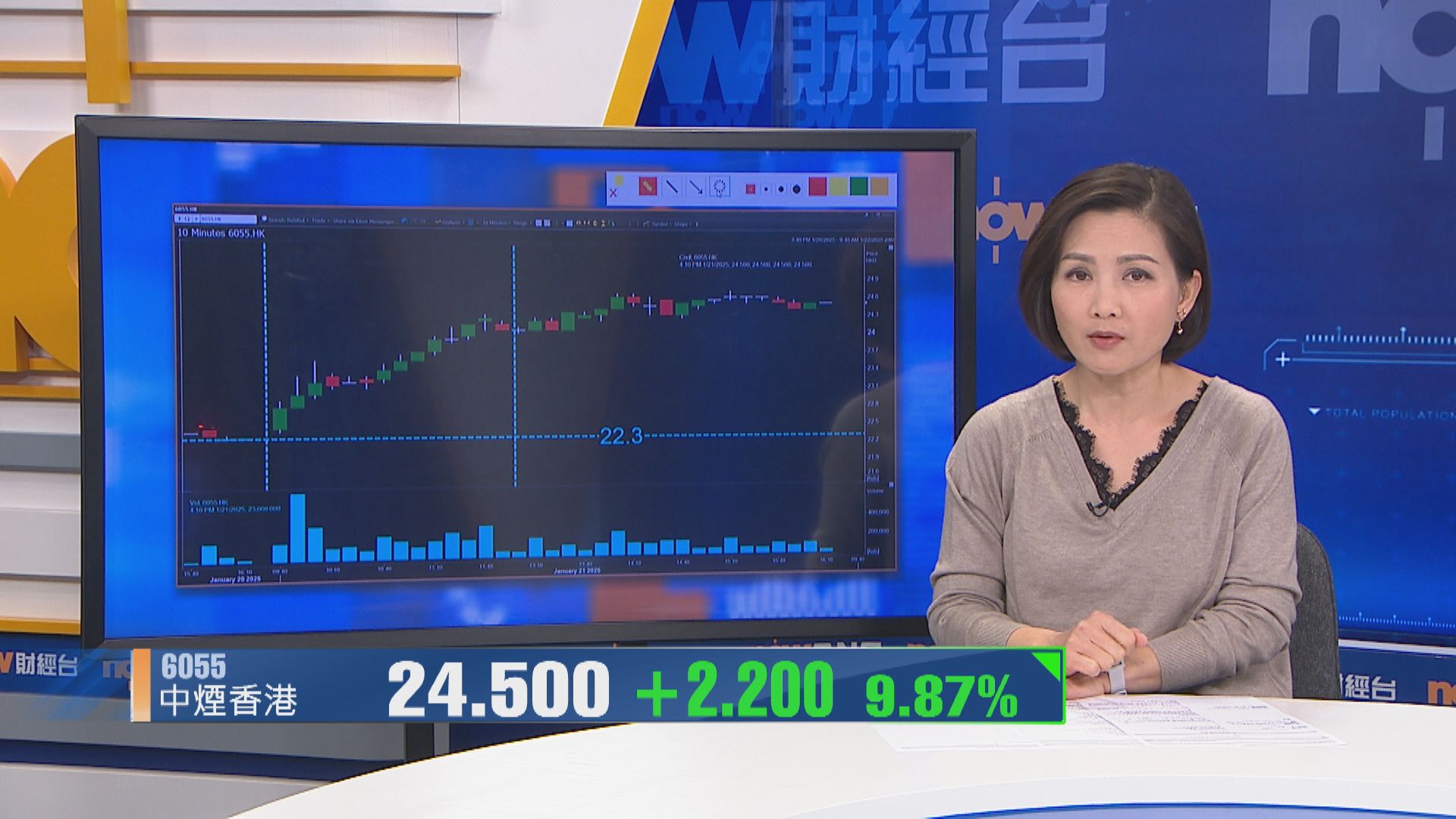 中煙喺2024年12月發盈喜,預料去年多賺最少30%,不過,去年下半年增長會小過上半年嘅40%,消息公布後,冇對股價有太大支持,仲反覆回落至上周一(13日)嘅100天線水平,中煙股價今日突然衝高,升穿10天及20天線外,亦一度衝破50天線,但最終企唔穩。