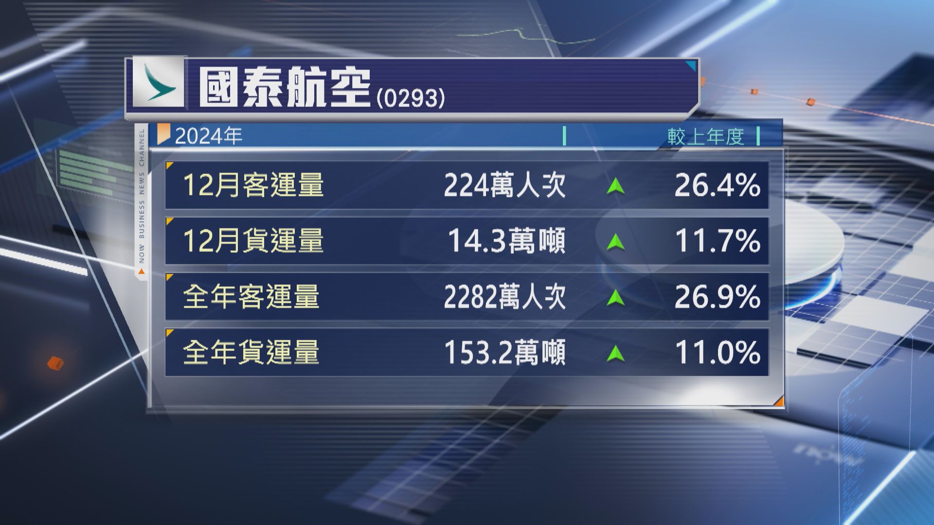 國泰去年12月客運量224萬人次,按年增長逾26%,貨運量則按年增長11%至14.3萬噸。去年累計,客運量及貨運量分別增長近27%和11%。