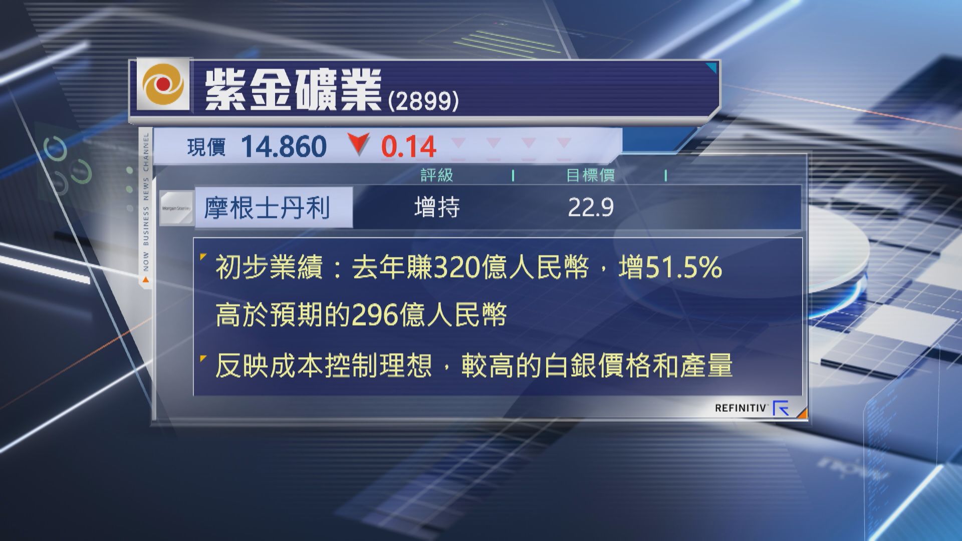 【Now財經台】紫金礦業(02899)公布業績快報,2024年賺320億元人民幣,按年增長約51%,摩根士丹利表示,紫金業績勝預期。