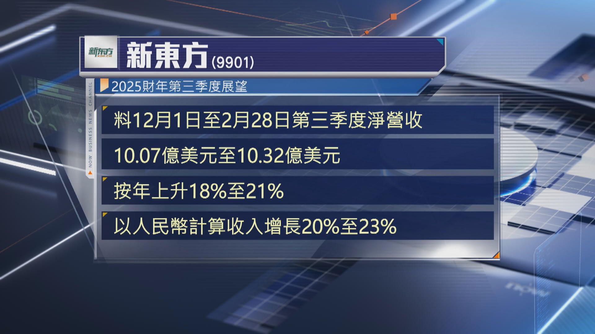 摩根士丹利引述管理層指,第3季度指標主要受消費環境疲弱,令出國考試準備業務、新業務及文化旅遊表現遜預期,拖低核心業務盈利1.5個百分點。管理層又預期,2025年財年的核心業務收入,由以美元計增長30%降至以人民幣計增長25%。