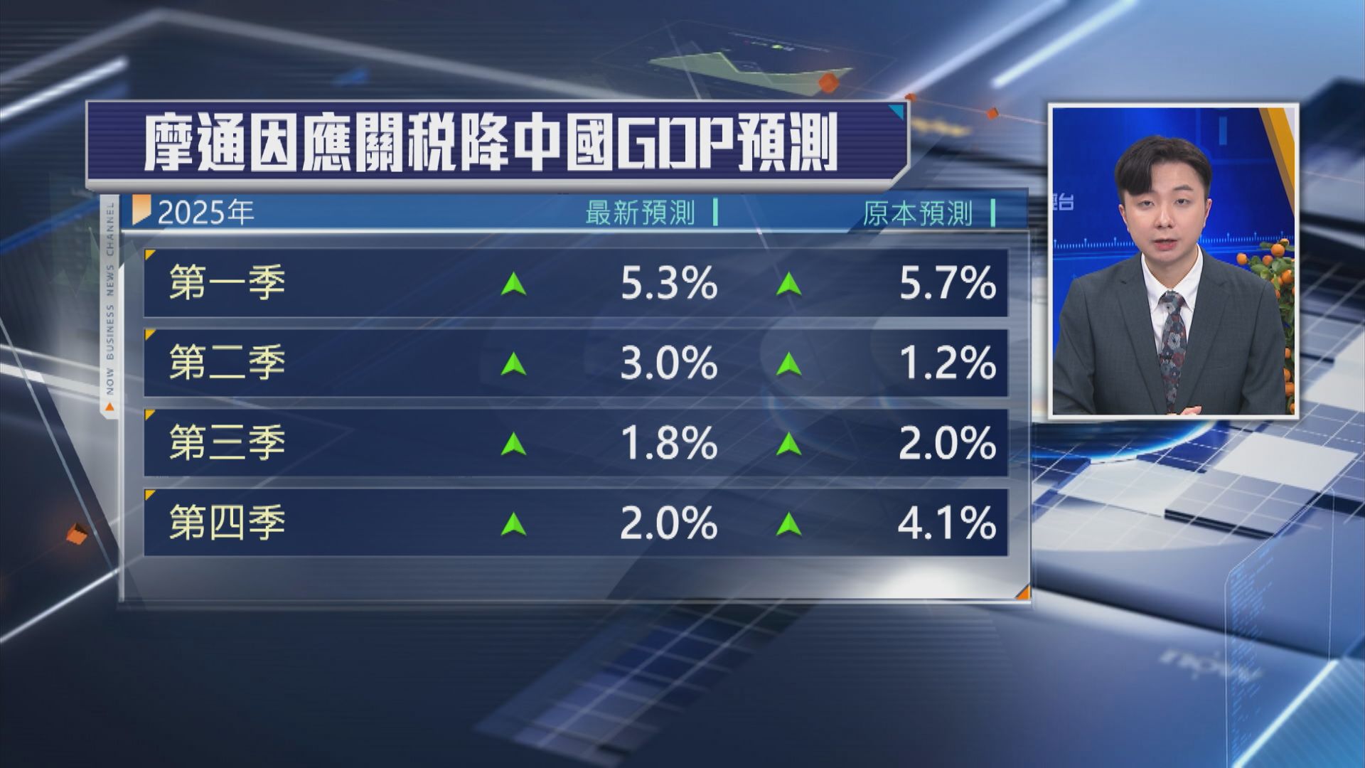 不過,考慮到關稅稅率將逐步上調,反而對第2季經濟增長有正面幫助,因此,上調第2季增長預測至3%。摩通又指,若關稅最終一如預期上調至60%,內地第3、第4季經濟增長將會受到重大衝擊,因此,下調第3、第4季增長預測至1.8%及2%。