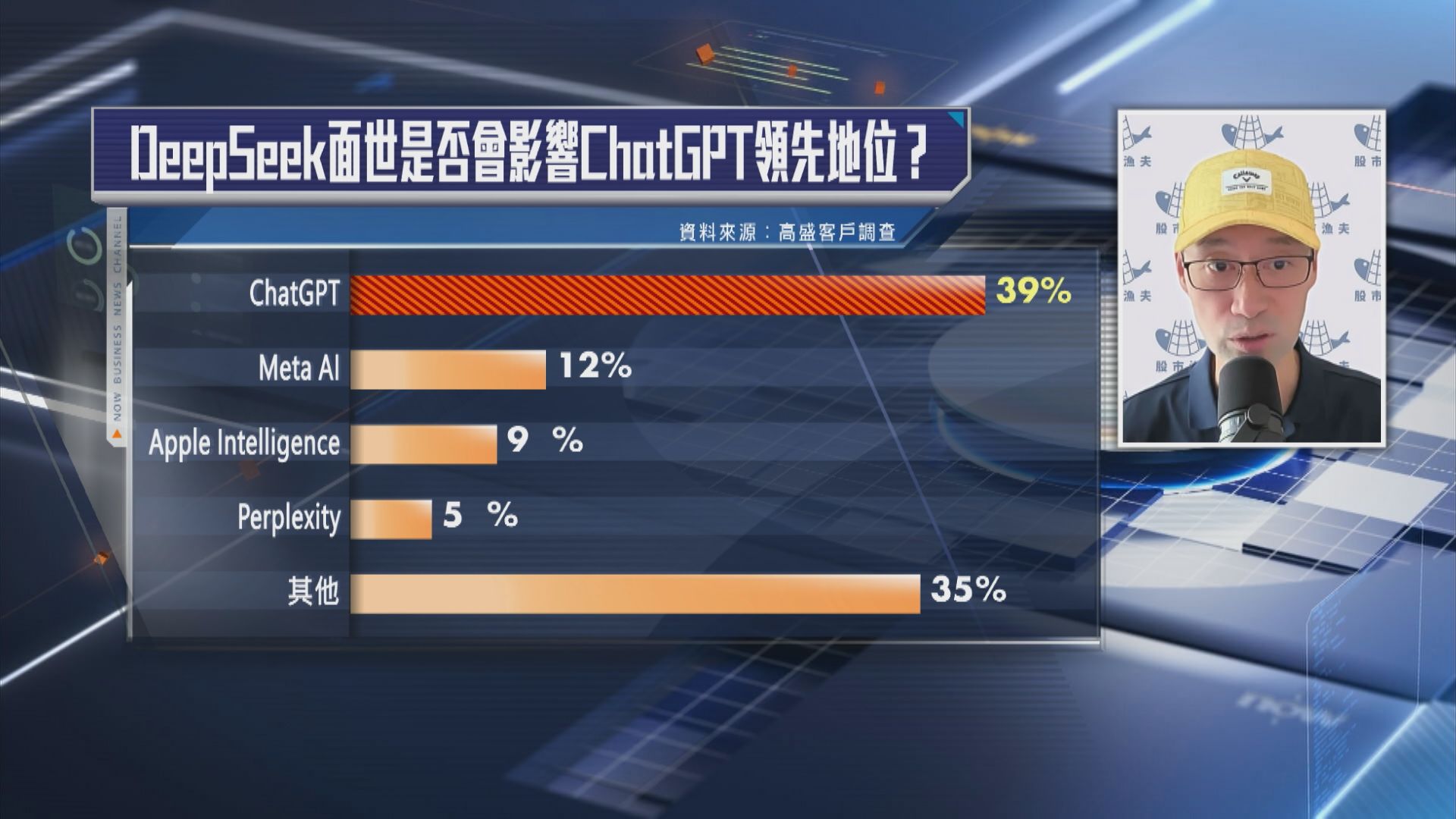 「股市漁夫」創辦人莊志雄指,先講機構投資者睇法,高盛做咗客戶調查,而高盛嘅主要客戶就係機構投資者,參考返高盛嘅客戶調查,喺DeepSeek面世後,客戶依然認為ChatGPT領先市場。