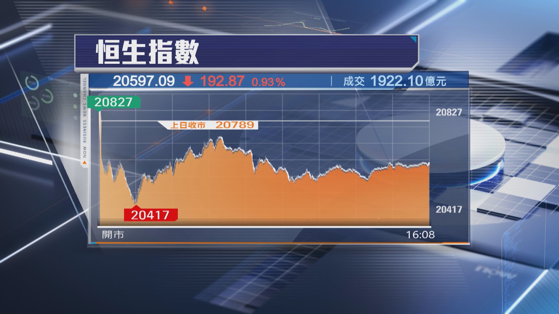 大市今日高開37點,已見了全日高位,其後倒跌,一度瀉372點,低見20417點,收市跌192點,報20597點。