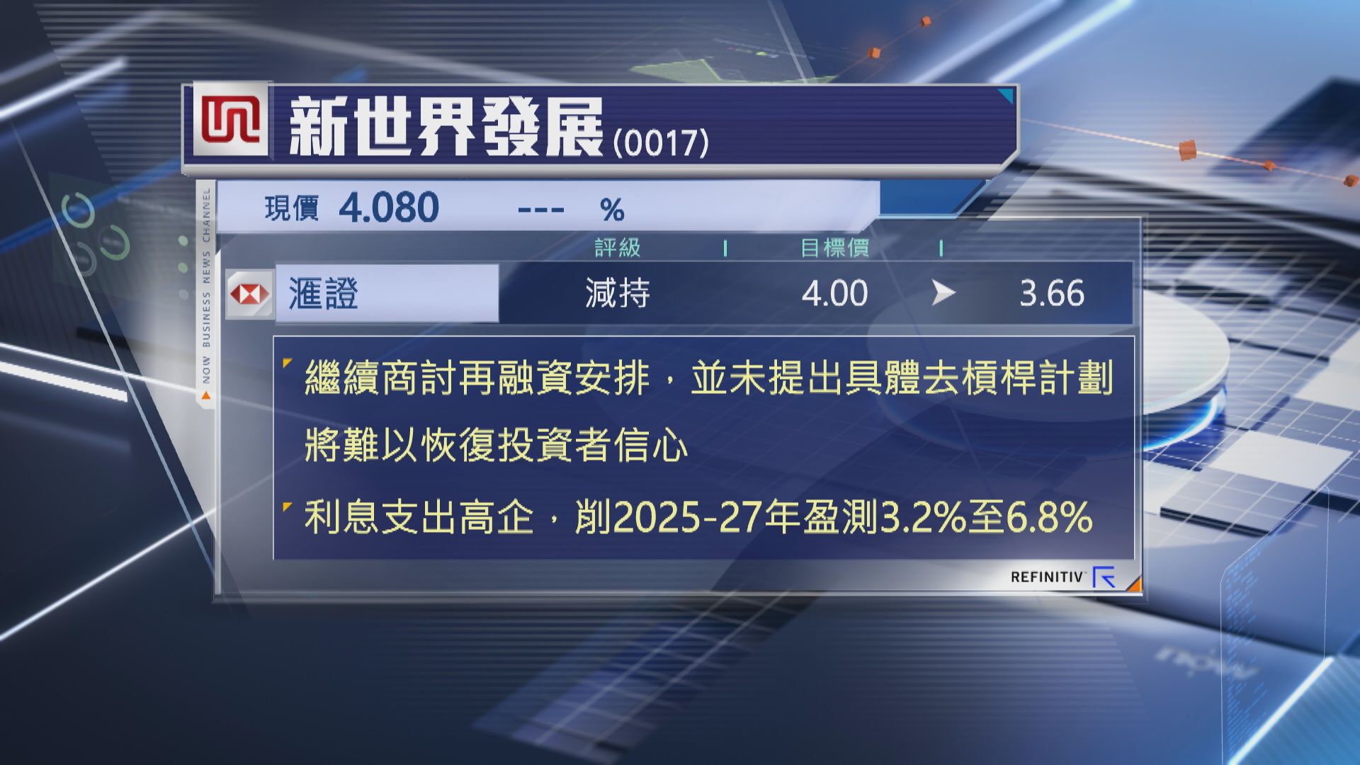【Now財經台】滙豐證券下調新世界發展(00017)目標價逾8%,由4元降至3.66元,維持「減持」評級。