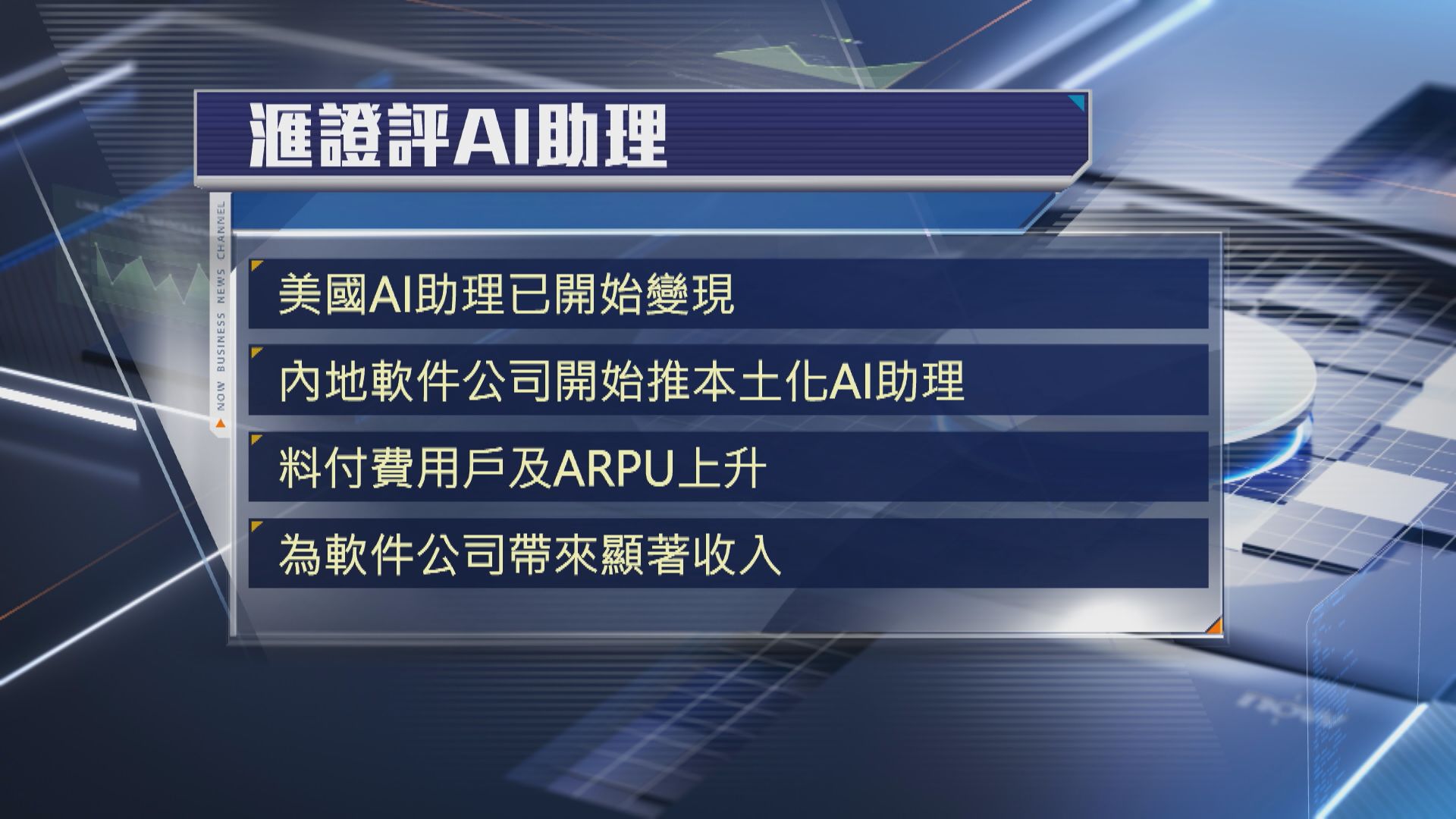 滙證又指,AI助理變現已在美國開始實現,而內地軟件公司亦開始推出本土化AI助理,例如金山辦公室的寫作助理,相信隨著付費用戶及平均每用戶收入增加,今年上半年AI助理將為相關軟件公司帶來顯著收入。