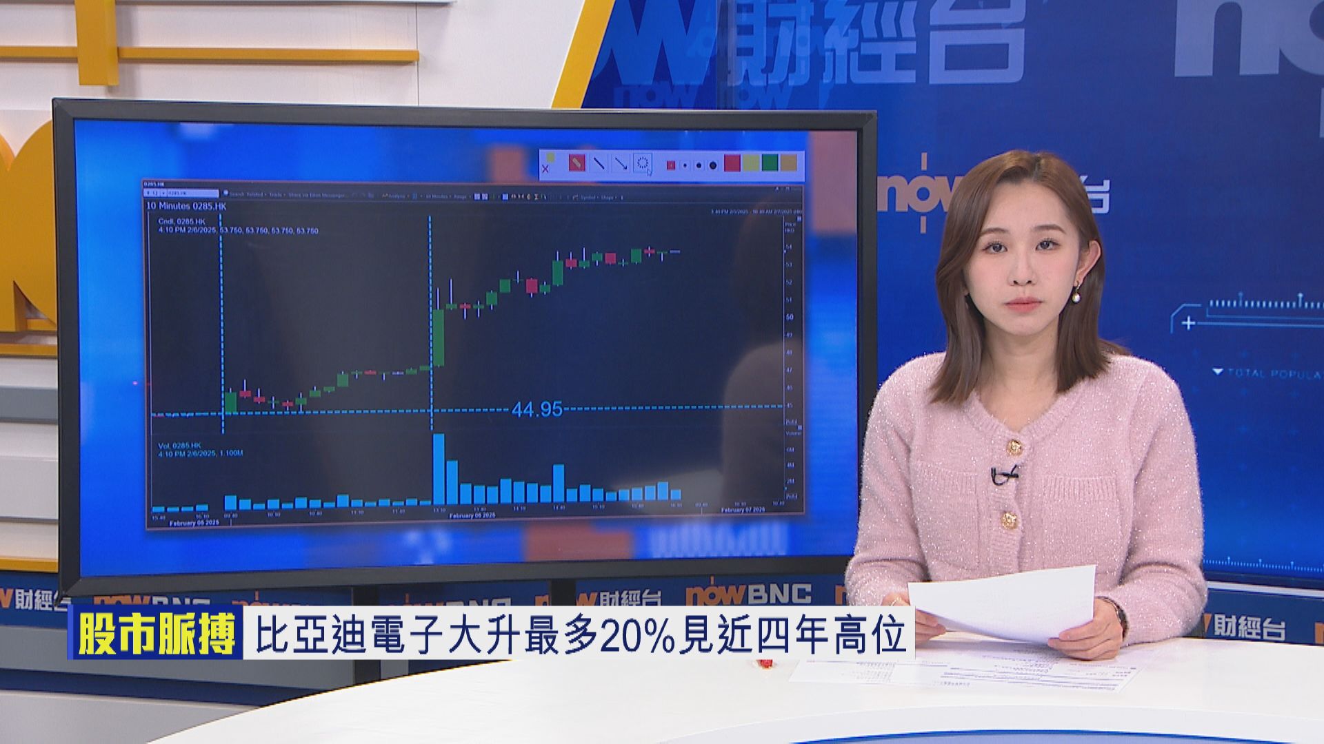 【Now財經台】比亞迪電子(00285)股價今日(6日)輕微高開後,走勢平穩,其後傳出同系比亞迪股份(01211)將於下周一(10日)舉行智能化戰略發布會,消息一出,資金喺下晝大舉湧入,比電股價最多升20%,高見54元,衝上近4年高,收市報53.75,勁升逾19%,成交股數較過去100日平均增2倍。