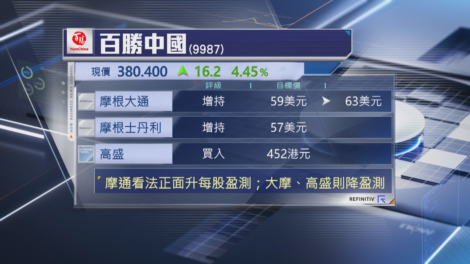 【Now財經台】百勝中國(09987)公布業績後,美股股價反應正面,獲摩根大通上調目標價,由59美元上調至63美元,並上調3年每股盈利預測0.5%至7%,評級「增持」,繼續是行業首選。