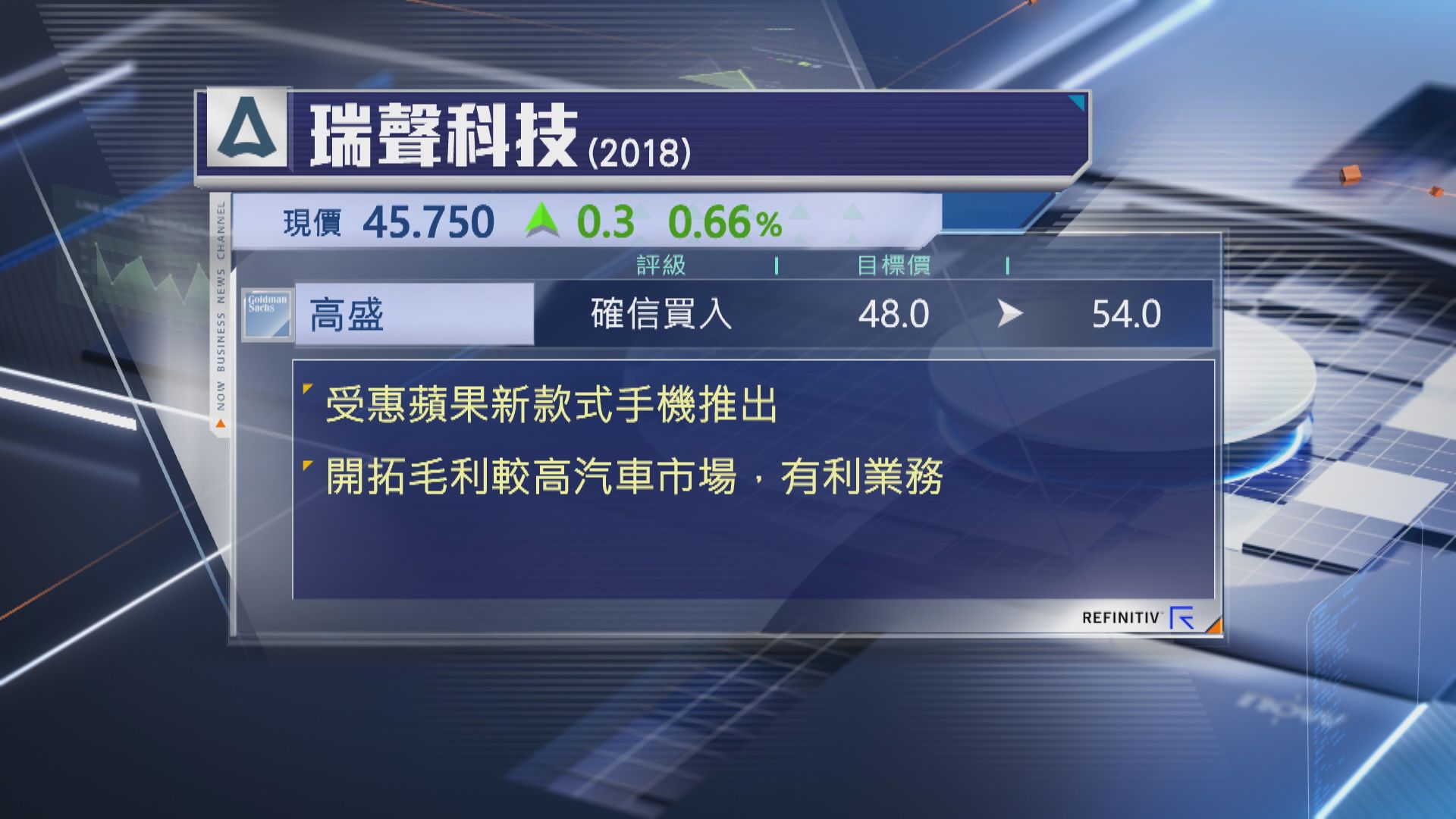 高盛預期,蘋果公司(Apple Inc.)新iPhone更薄及可摺疊,有助刺激需求,對Apple供應鏈股份正面,認為瑞聲是最受惠股份之一,又指集團聲學產品升級,令手機鏡頭業務改善及利用率上升,加上拓展至毛利率較高的自動駕駛市場,均有利業務前景,估計智能及高端手機升級,將推動聲學業務收入上升,輕微上調集團今年起3年盈利預測,目標價調高至54元,繼續在「確信買入」名單上。