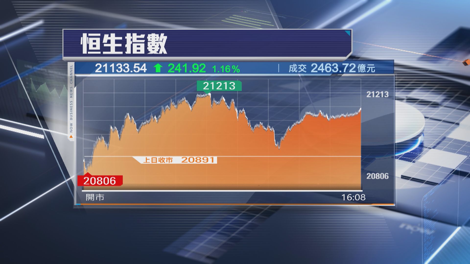 【Now財經台】本港股市連升兩日,恒生指數再升逾200點,衝上近4個月收市高位。
