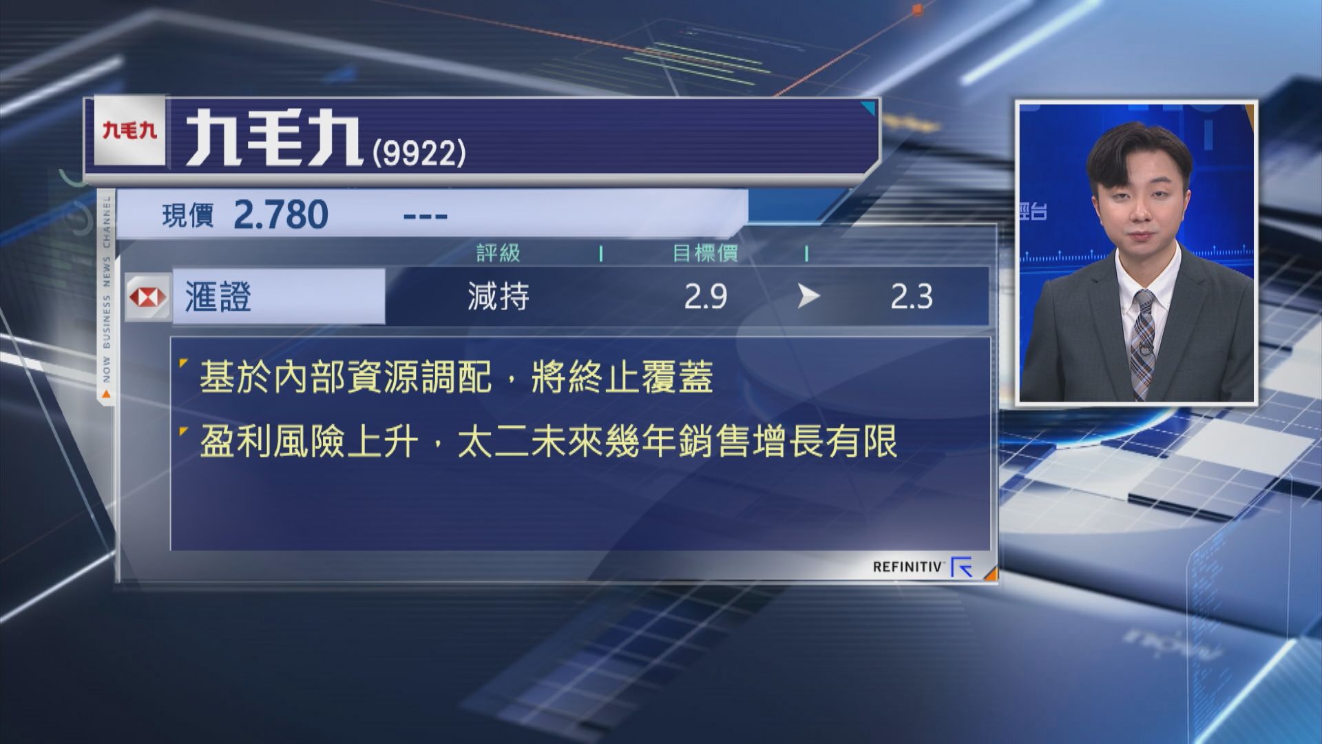 該行指出,基於內部資源調配,將會終止覆蓋九毛九,最終目標價2.3元,評級「減持」。
