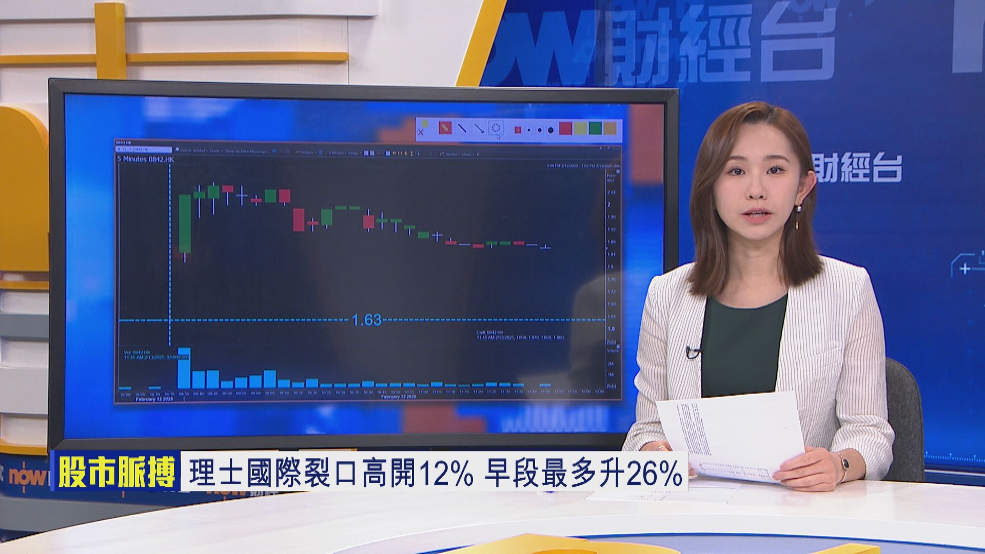 【Now財經台】理士國際(00842)股價今日(13日)高開近13%,升幅一度擴大至26%,高見2.06元,其後升幅收窄,暫時成交股數較過去100日平均大增57倍。