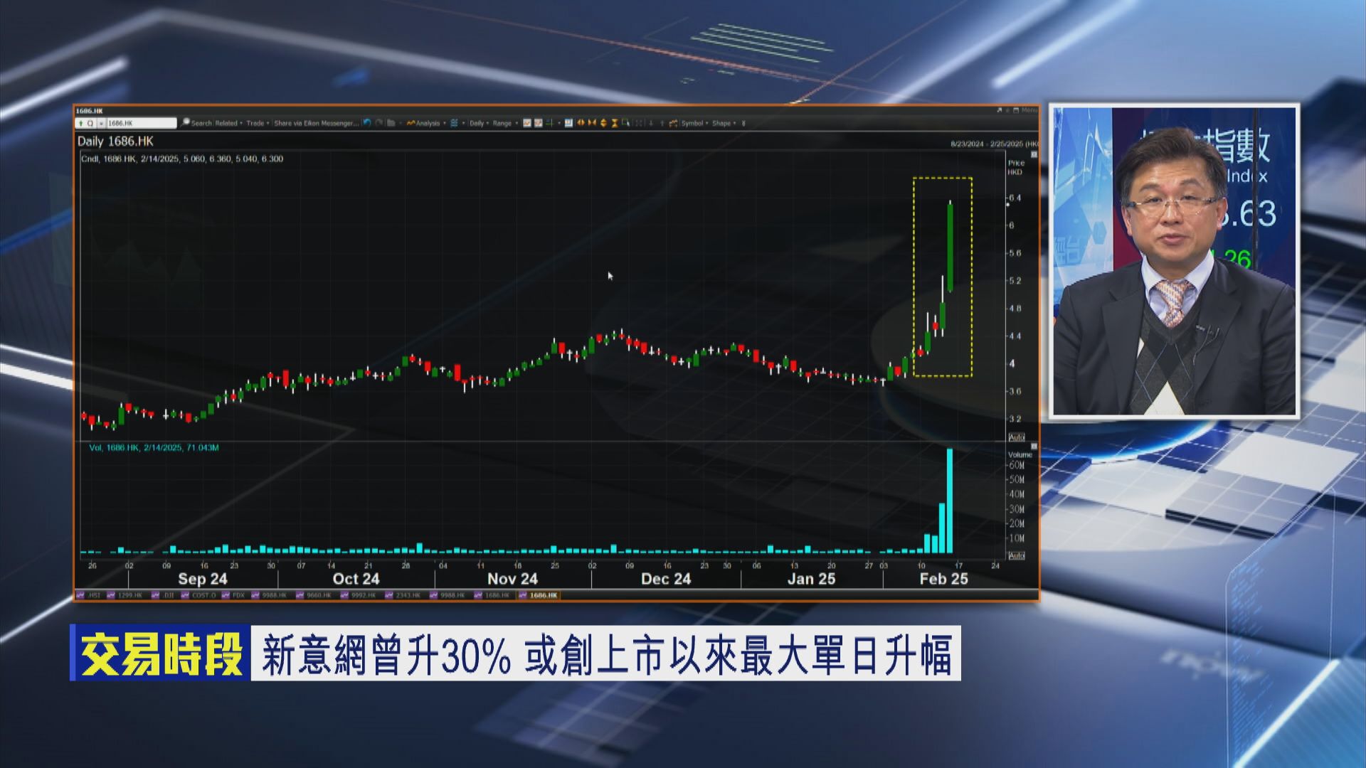 【Now財經台】新意網集團(01686)股價今日(14日)一度飆逾35%,高見6.6元,衝上兩年半高位,成交亦急增,暫時成交金額逾4億元,近期不斷有資金追入新意網,估計係受惠於近期嘅DeepSeek熱潮,新意網升勢可唔可以持續?