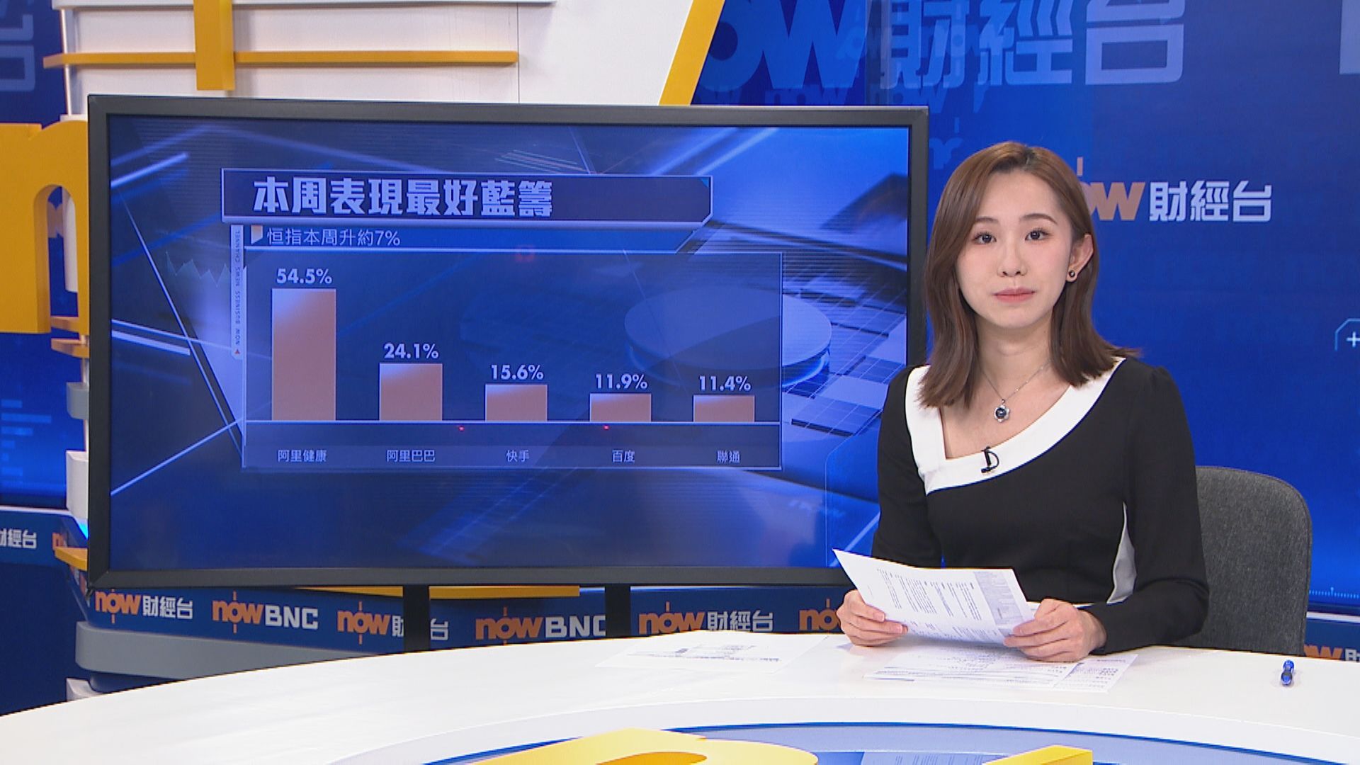 本周表現最佳藍籌,依次為阿里健康(00241)升54.5%、阿里巴巴(09988)升24.1%、快手(01024)升15.6%、百度集團(09888)升11.9%、中國聯通(00762)升11.4%。