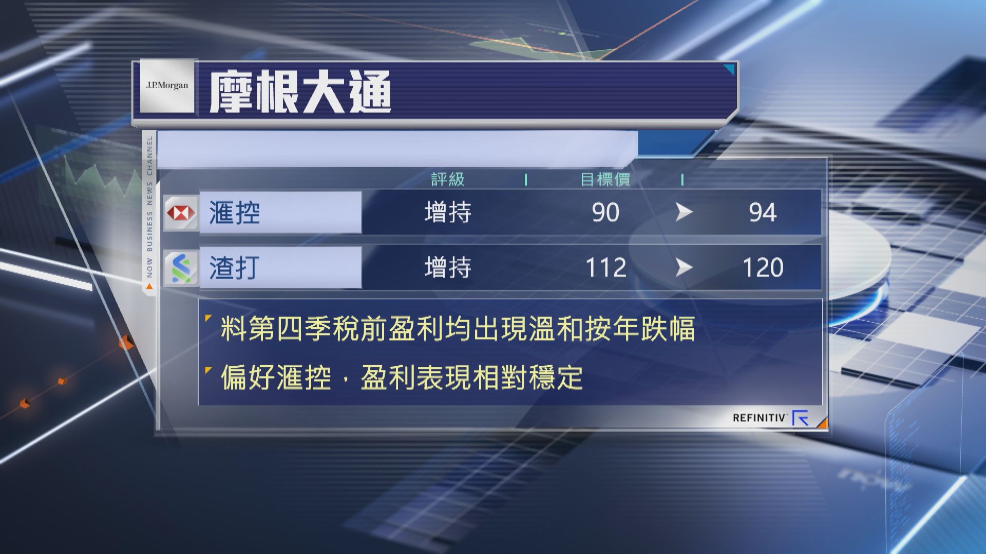 摩通指,雖然預計滙控及渣打第4季稅前盈利錄得溫和按年跌幅,當中淨利息收入仍然保持增長,兩家銀行當中,滙控盈利表現相對較穩定,考慮到該行的成本控制計劃,預計最樂觀情況下可以節省30億美元,有力支持股本回報維持在13%至14%,因此較偏好滙控。