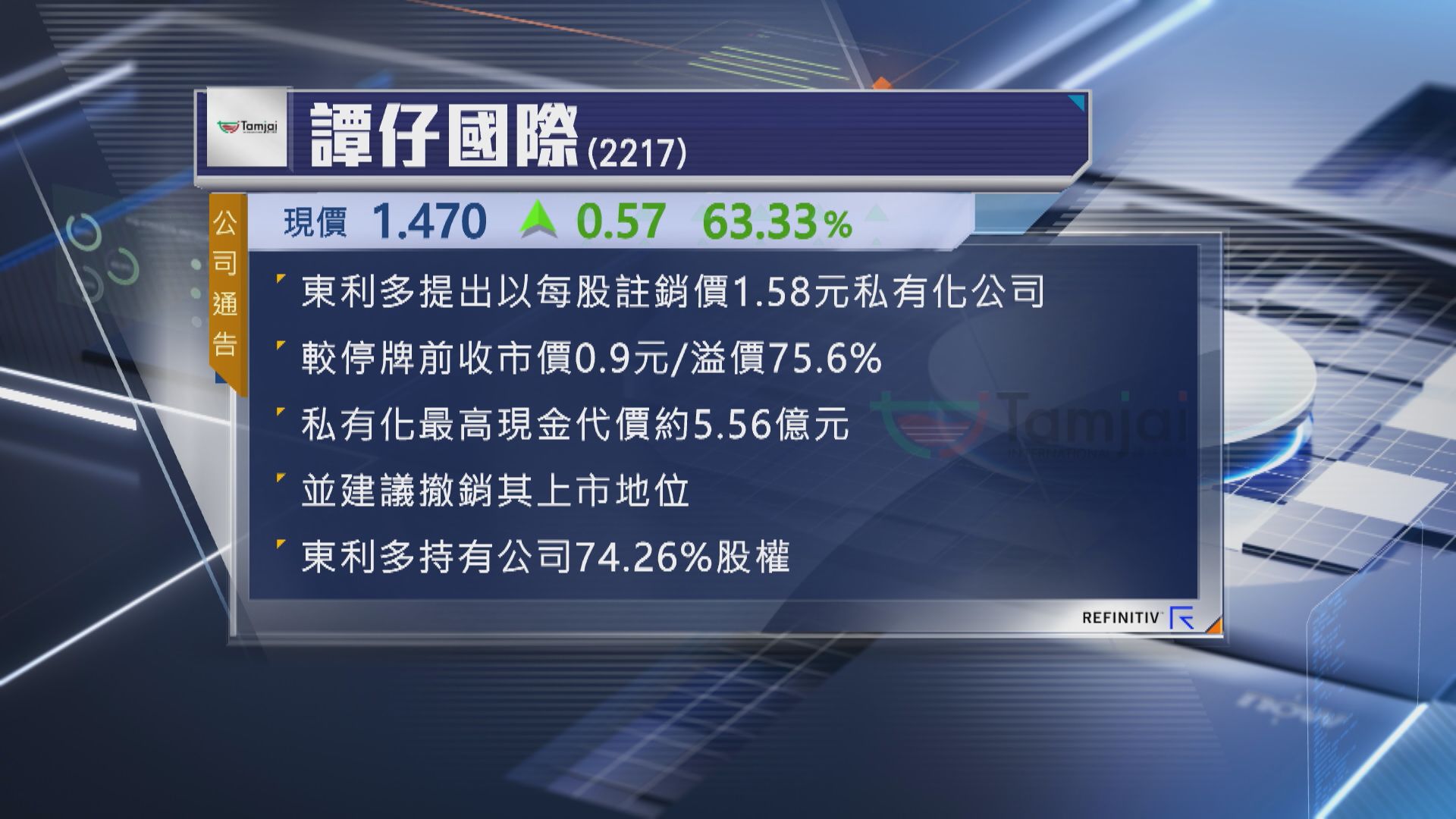 譚仔國際高開64%,開市報1.48元,較大股東私有化作價每股1.58元低約6%。東利多提出以每股1.58元私有化譚仔國際,較譚仔停牌前收市價溢價75%以上,私有化最高現金代價約5.56億元,並建議撤銷譚仔的上市地位,經營全球最大烏冬連鎖店丸龜製麵的東利多持有74.26%譚仔股權。