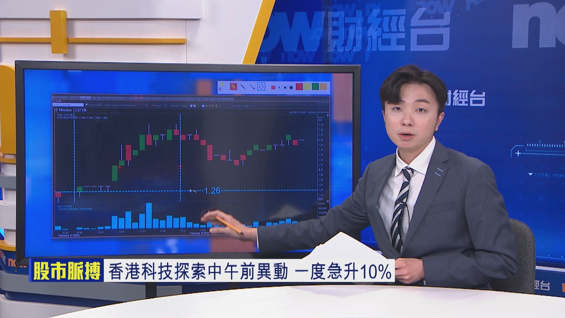 【Now財經台】香港科技探索(01137)今早(18日)平開,10時後開始異動,成交湧入,股價抽升,最多升逾10%,高見1.39元,超過1個月高位。成交股數較過去100日平均增加6倍。