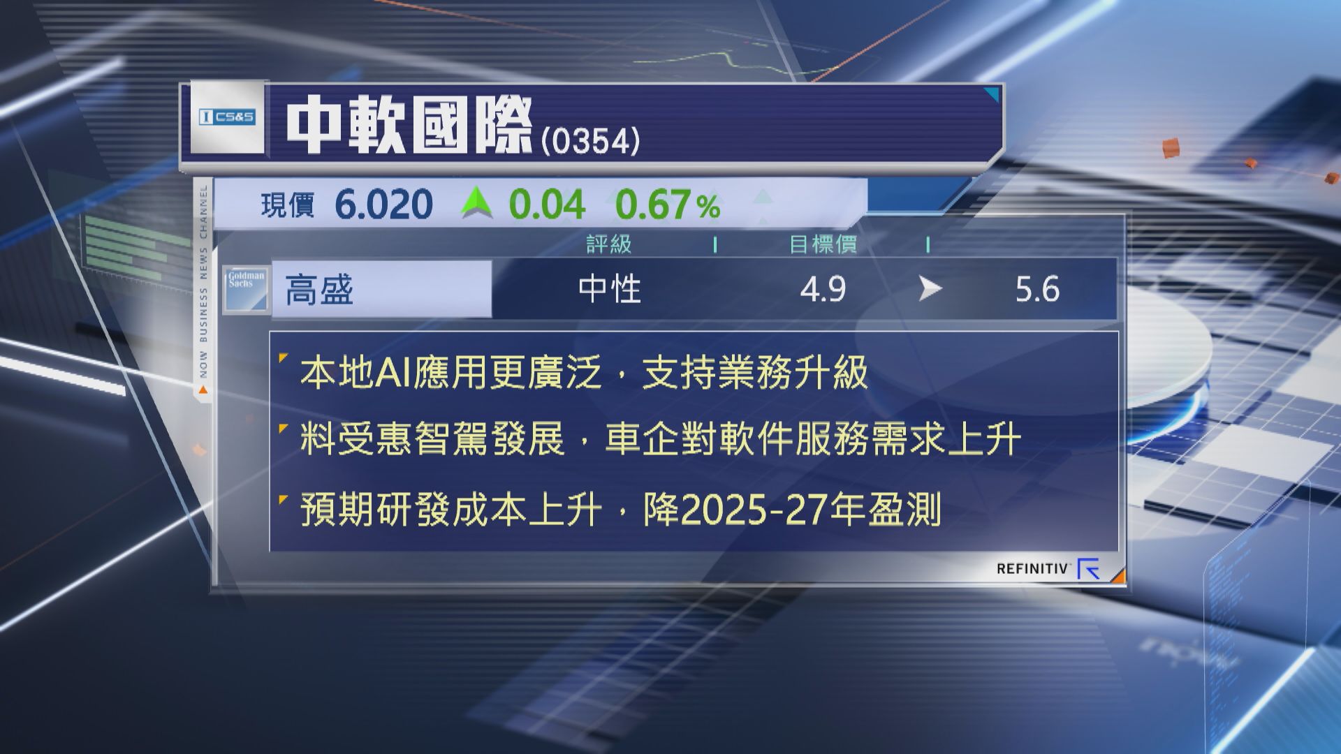 【Now財經台】高盛升中國軟件國際(00354)目標價14%。