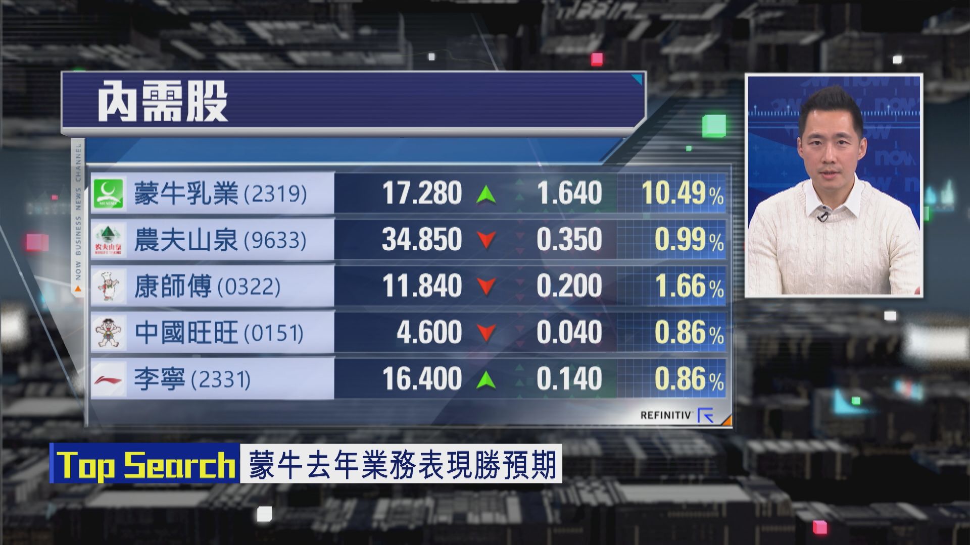 【Now財經台】截至早上11時止,1小時內《彭博》搜尋量最多港股,依次為蒙牛乳業(02319)、華虹半導體(01347)、中芯國際(00981)、晶泰控股(02228)及優必選(09880)。