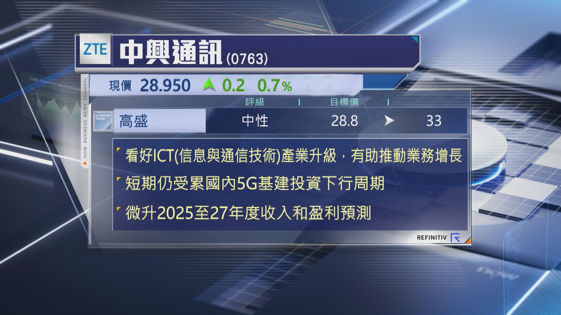 【Now財經台】高盛看好中興通訊(00763)的新科技業務發展,調升收入和盈利預測,並升目標價約15%。