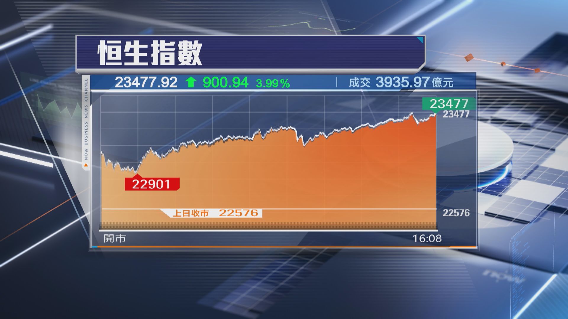 大市今日(21日)高開513點後,升幅逐步擴大,先衝破去年10月高位,午後升幅進一步擴大,最終以全日高位收市,勁升900點,收報23477點,升上近3年高位。大市全日成交增至逾3935億元。