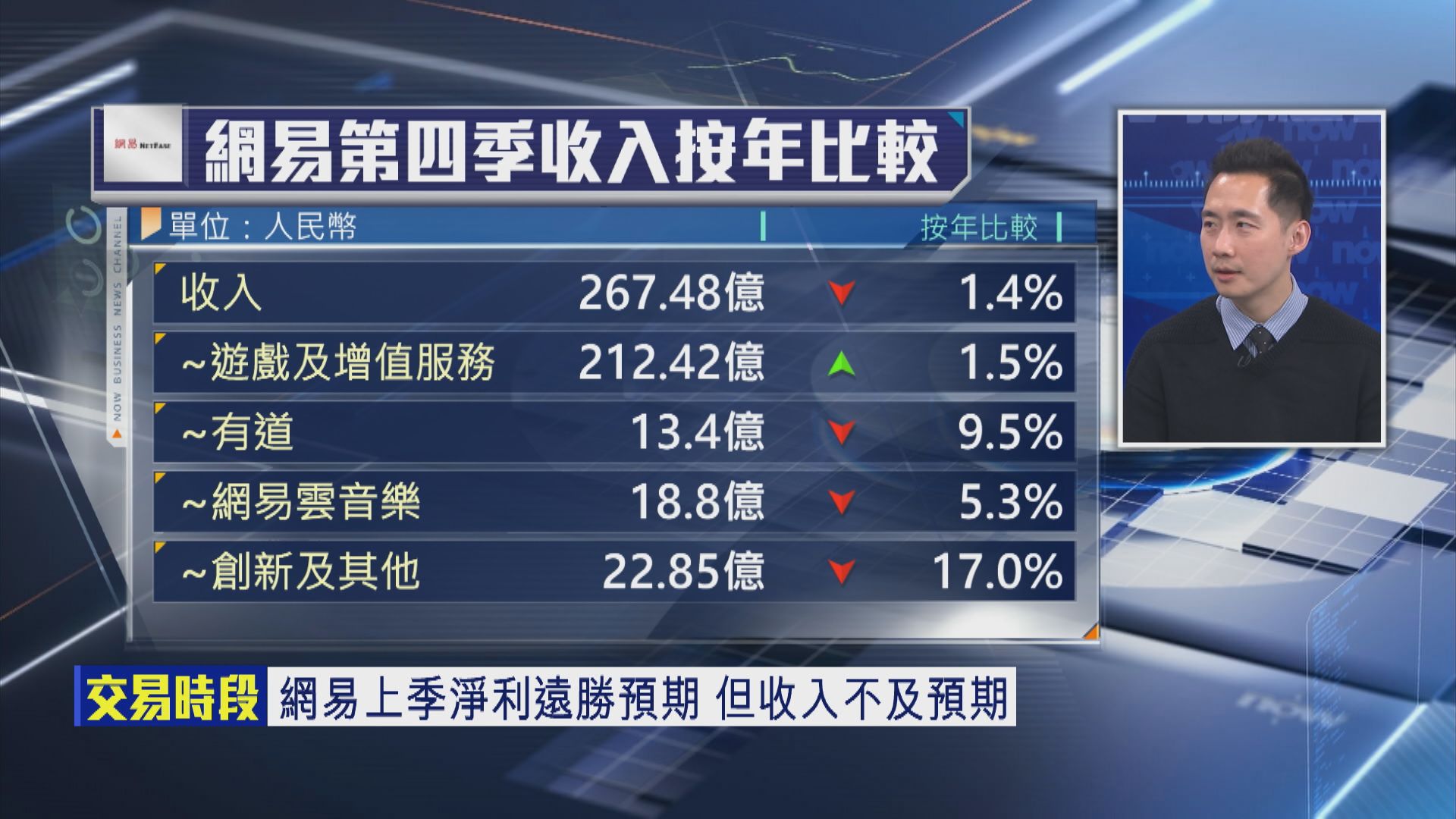 【Now財經台】港股今日(21日)喺科技股帶領下升勢凌厲,衝上近3年高位,不過,昨日(20日)出咗業績嘅網易(09999)表現就比較差,早段一度逆市跌逾3%,午後逐步收復失地。網易上季純利超預期,但收入要跌兼差過預期。不過,大行仍力撐網易,摩根大通相信網易今年每股盈利可以獲得重估,摩根士丹利就指,網易新Game《界外狂潮》會喺今年3月6日全球上線,有望成為下個關鍵催化劑,網易股價係咪唔使睇得太淡?