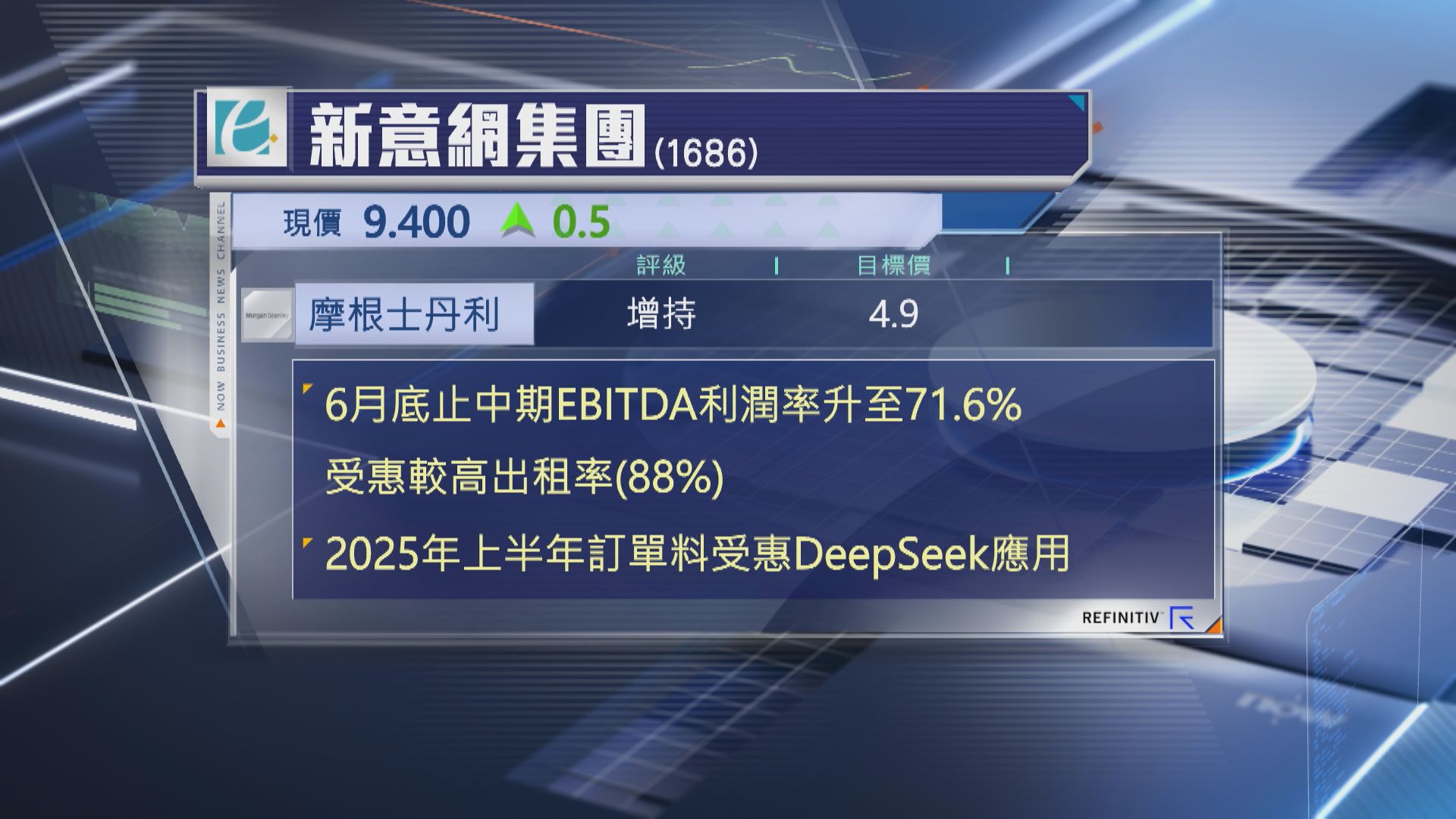 管理層表示,自DeepSeek R1大模型被廣泛應用,令旗下數據中心需求增加,其中,有兩名內地超級大客戶希望藉此加快擴大人工智能(AI)應用,大摩估計,新意網上半年定單將會增加,維持「增持」評級及目標價4.9元不變。