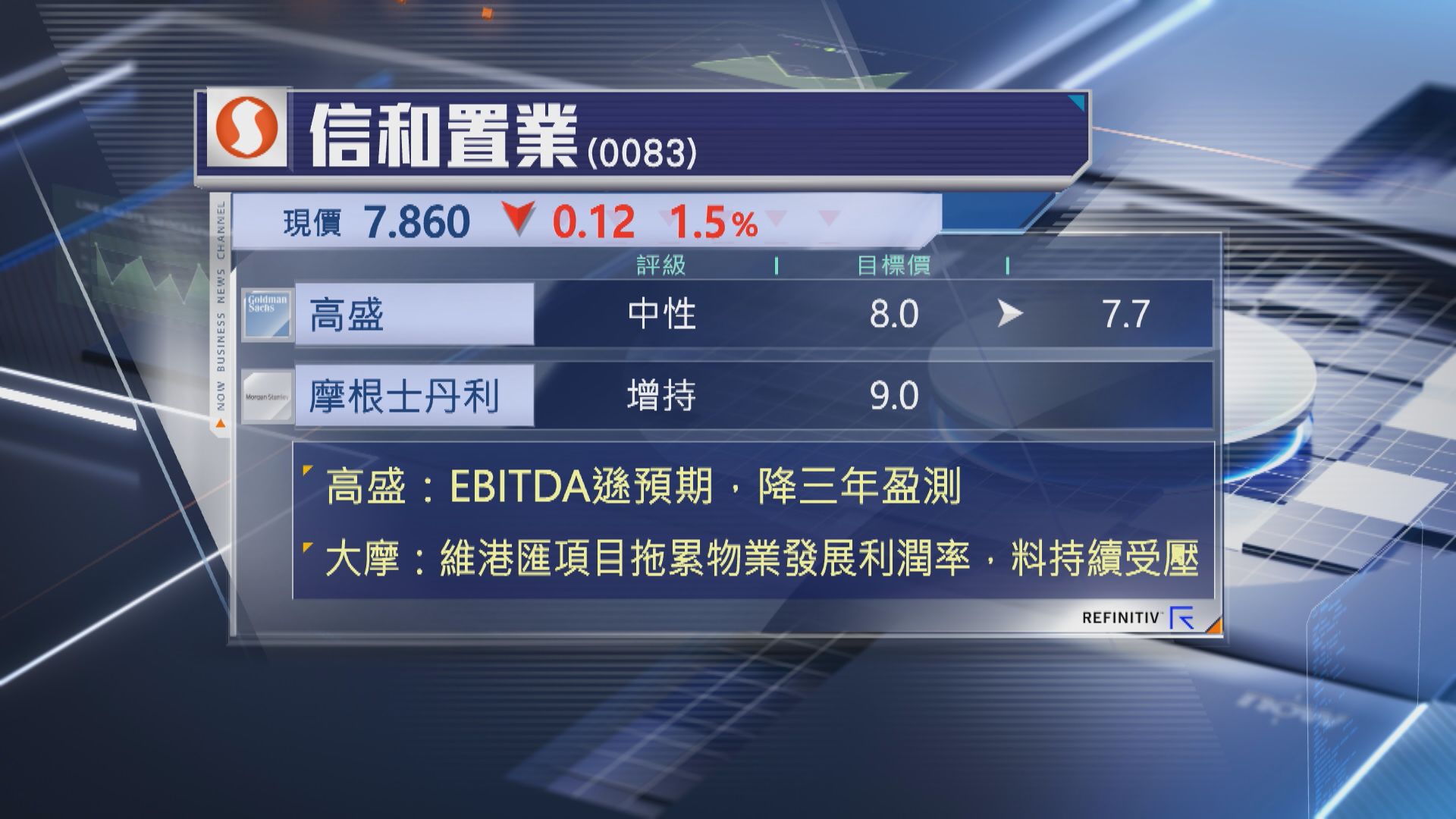 高盛指,信置每股盈利及派息符預期,但物業發展入帳減少,令撇除利息、稅項、折舊及攤銷前盈利(EBITDA)較預期少10%,因此,下調未來3年每股盈測,並相應下調目標價至7.7元,維持「中性」評級。