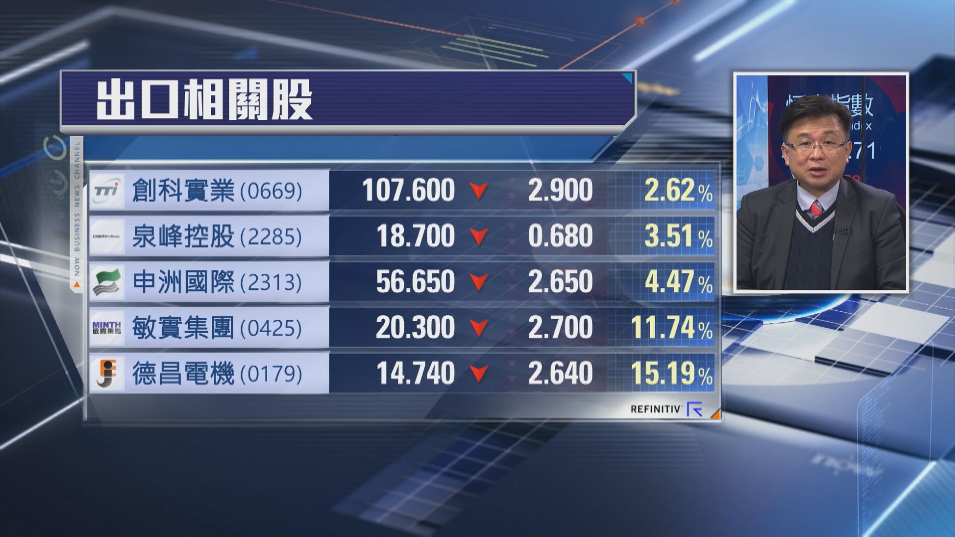 【Now財經台】美國總統特朗普(Donald Trump)昨晚(27日)突然宣布再加中國貨10%關稅,即累計加20%關稅,其中,美國出口業務佔比最大嘅公司如創科實業(00669)、泉峰控股(02285),股價今日(28日)竟跌得唔多,反而北美市場收入佔比較少嘅德昌電機控股(00179)、敏實集團(00425)跌得仲多,申洲國際(02313)及裕元集團(00551)就微跌和靠穩,點解讀呢個現象?