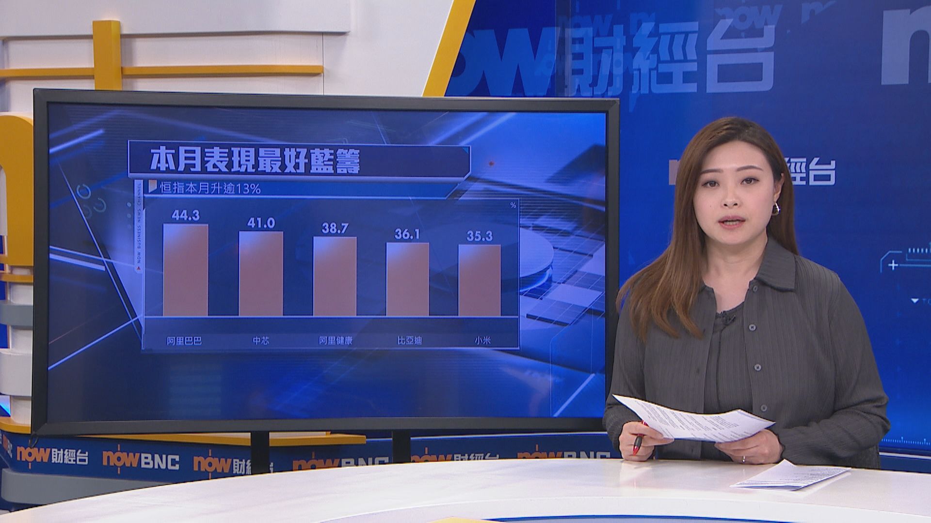 本月表現最佳藍籌,依次為阿里巴巴(09988)升44.3%、中芯國際(00981)升41%、阿里健康(00241)升38.7%、比亞迪股份(01211)升36.1%、小米集團(01810)升35.3%。