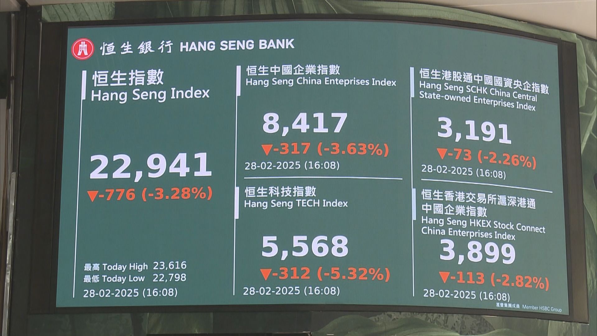 【Now財經台】憂慮中美貿易戰升溫,本港股市於2月最後一個交易日急瀉,恒生指數重挫逾700點,失守23000關。