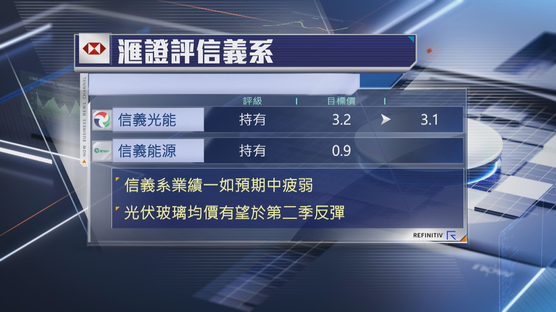 【Now財經台】信義系公布業績後,滙豐證券輕微下調信義光能(00968)目標價,但預期光伏玻璃價格於第2季有望回升,目標價由3.2元降至3.1元,信義能源(03868)目標價則維持0.9元,維持兩隻股份「持有」評級。
