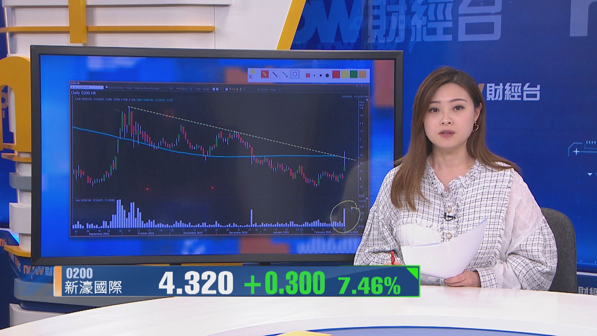 【Now財經台】新濠國際發展(00200)股價今日(3日)裂口高開逾4%後,升幅一度擴大至逾16%,高見4.69元,升至今年高位,其後升幅收窄,成交股數較過去100日平均增2.5倍。