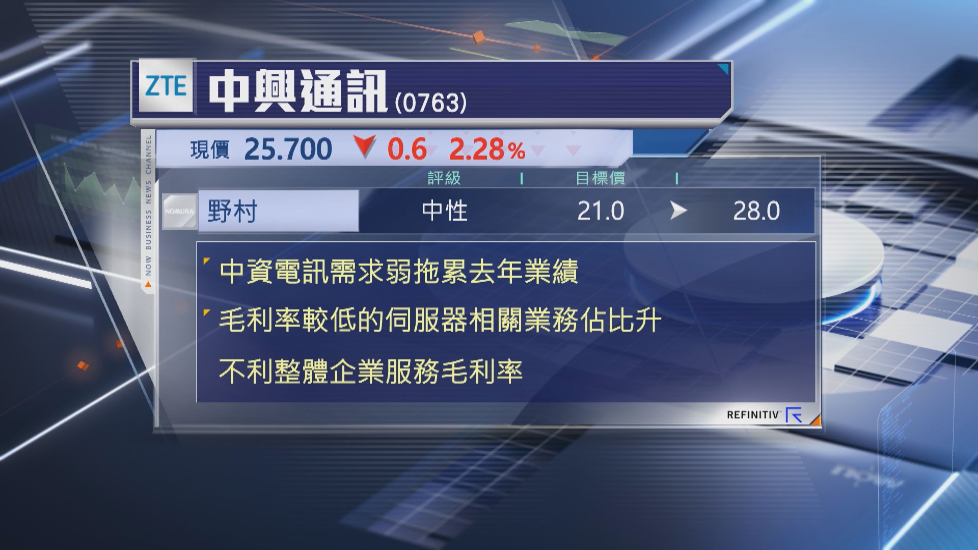 該行指,中興去年收入及盈利按年均要跌,相信是受中資電訊企業持續需求疲弱影響。雖然消費及其他企業業務增長維持穩健,但在只有較低毛利率的伺服器業務增長下,令企業服務分項毛利率按年大跌近20個百分點,因此,下調集團今、明兩年收入預測,以反映電訊業需求減少。