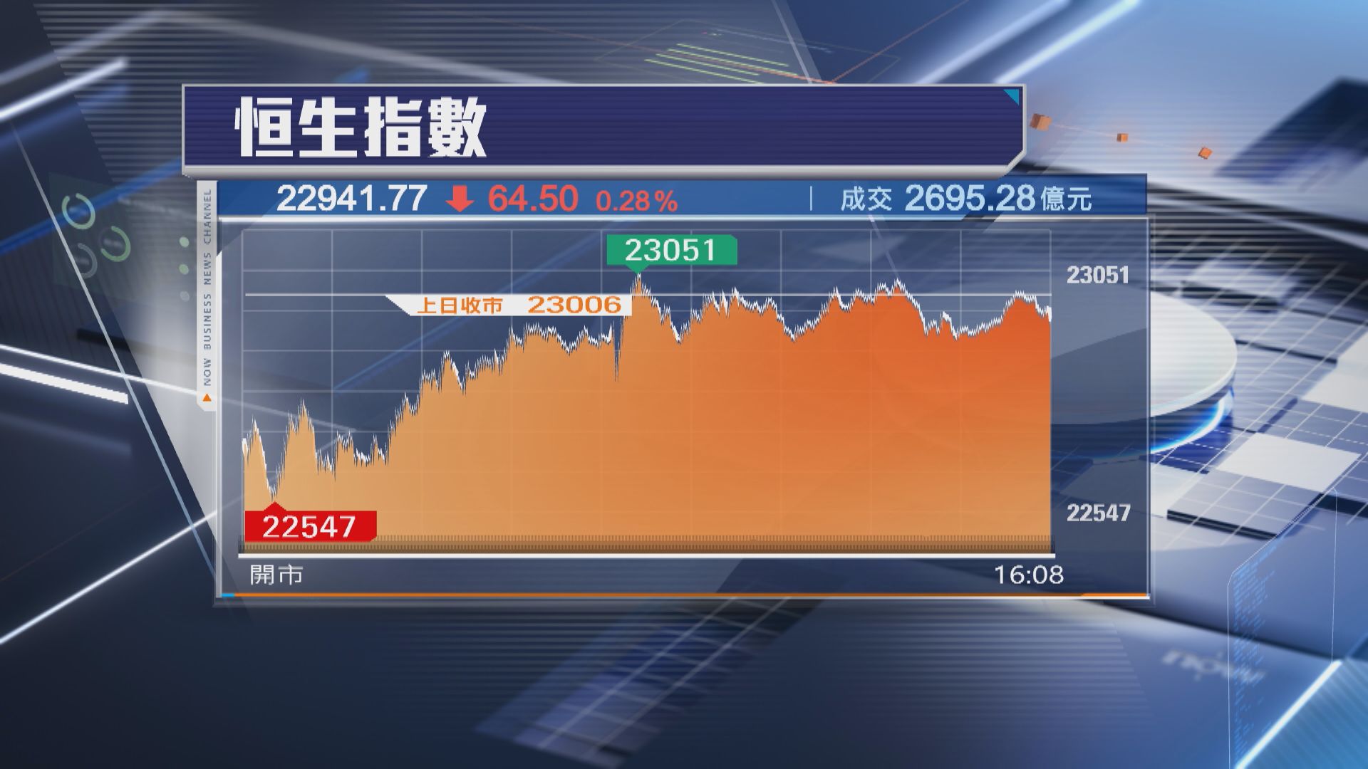 恒生指數今日(4日)低開328點後,跌幅一度擴大至458點,午後中國宣布反制美方的措施,大市曾短暫倒升逾40點,收市跌64點,報22941點。大市全日成交縮減至逾2695億元。