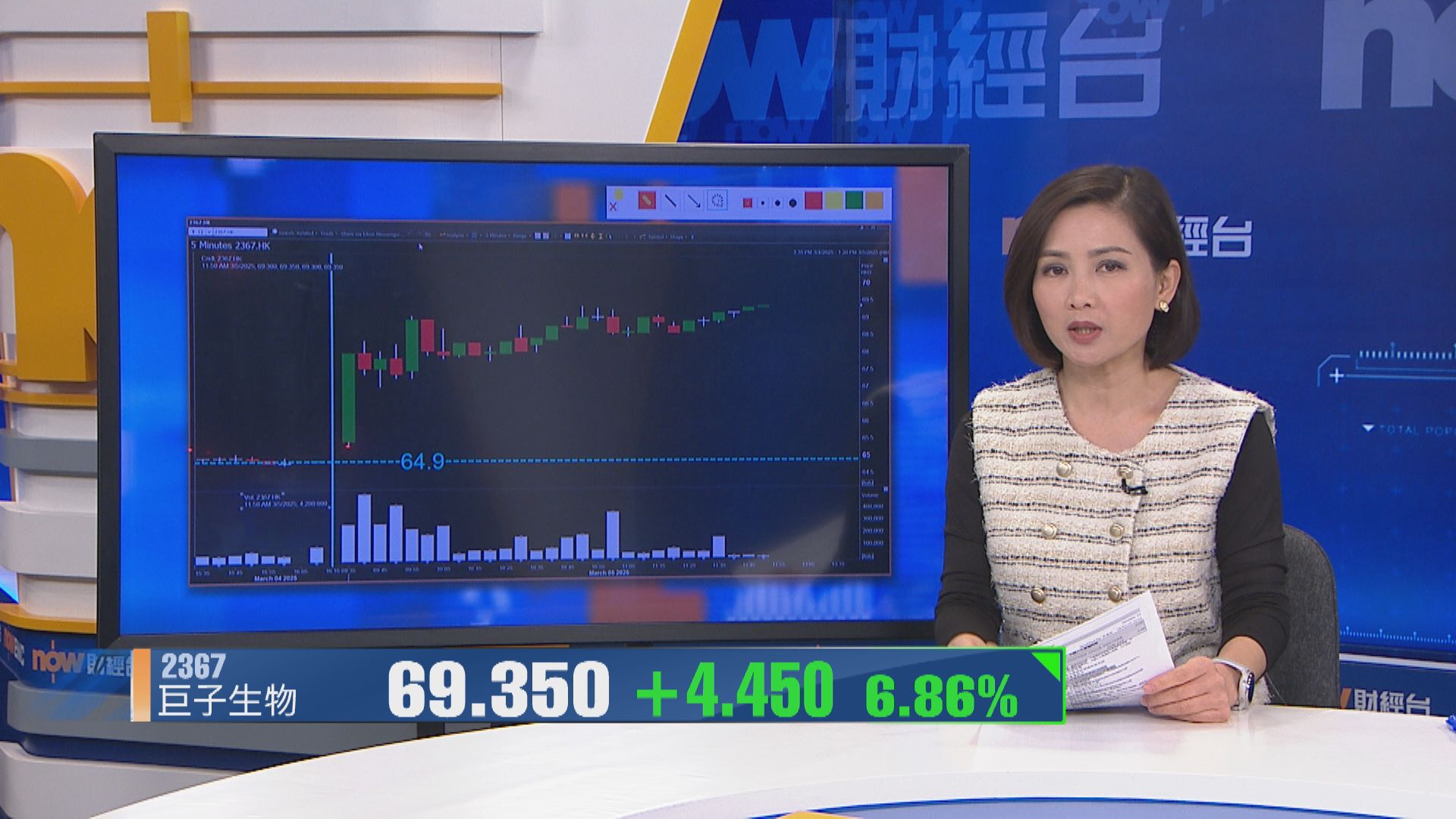【Now財經台】巨子生物(02367)股價今早(5日)高開1%後,升幅一度擴大至7%,高見69.55元,創新高,升勢亦有成交配合,成交股數較過去100日同時段平均增約2倍。