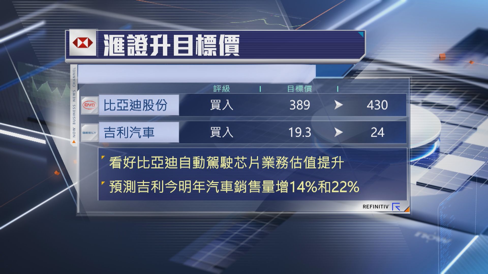 【Now財經台】滙豐證券因應自動駕駛趨向大眾化發展,預期新產品周期有助推高銷售及盈利,上調比亞迪股份(01211)、吉利汽車(00175)、理想汽車(02015)、小鵬汽車(09868)目標價15%至69%。