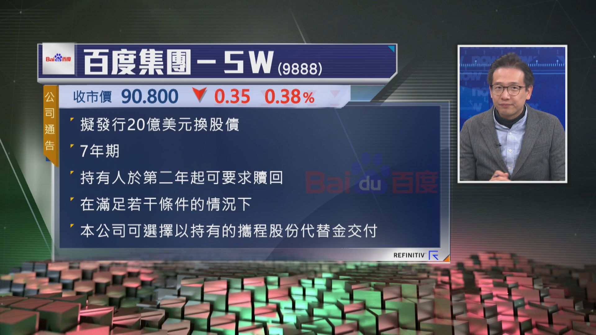 【Now財經台】百度集團(09888)計劃發行20億美元換股債(CB),債券為七年期,可兌換攜程集團(09961)股份。