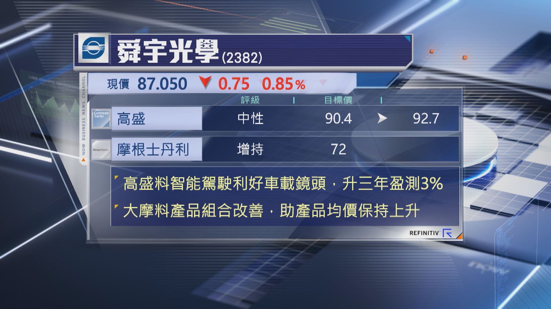 高盛指,車載鏡頭出貨量按年仍錄得增長,反映產品受惠於智能駕駛需求增加,可望帶動整體收入,上調舜宇今年至2027年盈利預測3%。