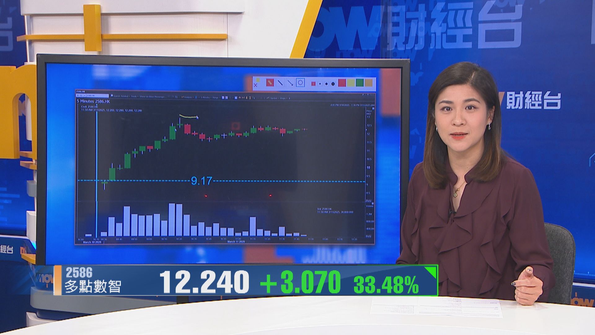 【Now財經台】深交所昨日(10日)公布,將多點智數(02586)納入港股通,但股價昨日不升反跌,收市重挫近15%。不過,今朝(11日)低開近2%後,好快已倒升,一度爆升40%,高見12.84元。成交股數逾1900萬股,半日成交金額逾2.2億元。
